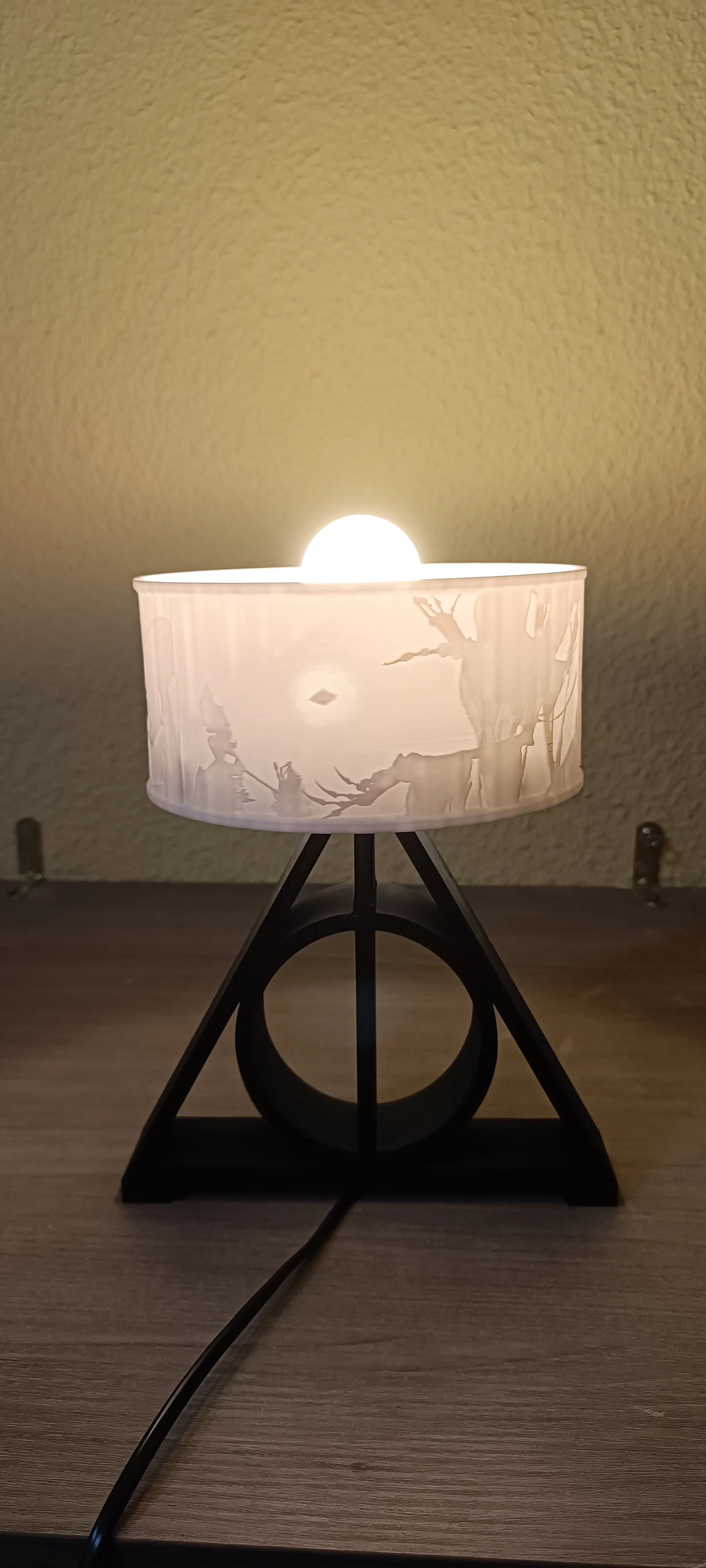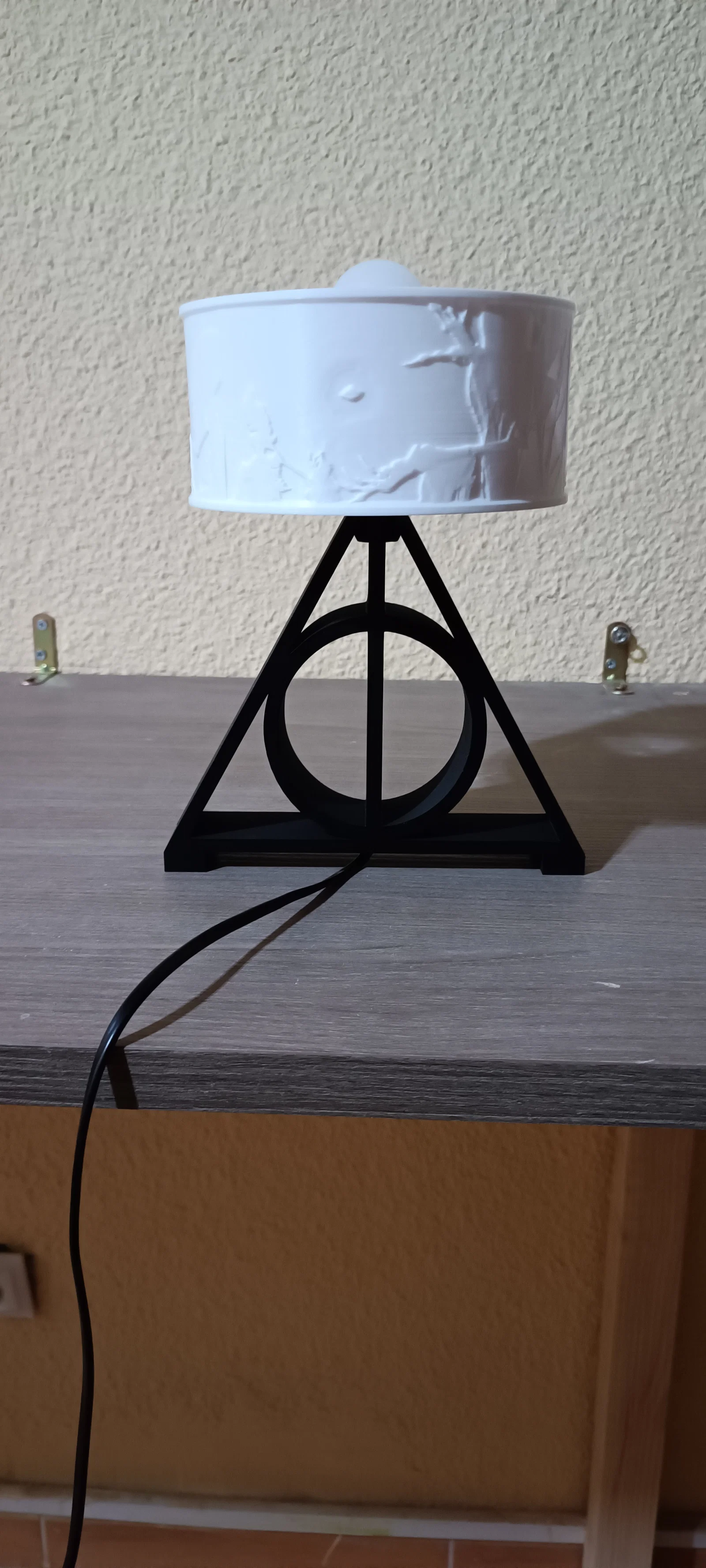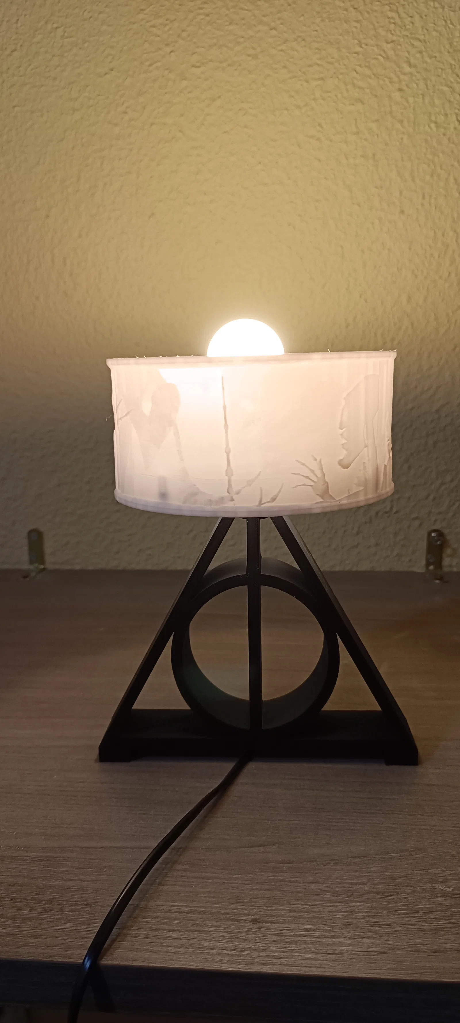 Nếu bạn là một người hâm mộ cuồng nhiệt của thế giới phù thủy Harry Potter, thì đây chắc chắn là món đồ trang trí không thể thiếu trên bàn làm việc hoặc tủ đầu giường của bạn. Sản phẩm này là một chiếc đèn ngủ dạng litophane độc đáo, tái hiện hình ảnh đầy ấn tượng về "Bảo bối Tử thần" – một biểu tượng kinh điển trong hành trình khám phá thế giới phép thuật huyền bí. Với thiết kế tinh tế kết hợp giữa phần chụp đèn bằng nhựa in 3D với chi tiết nổi bật và phần đế hình biểu tượng Bảo bối Tử thần, chiếc đèn này không chỉ cung cấp ánh sáng dịu nhẹ mà còn tạo điểm nhấn nghệ thuật cực kỳ bắt mắt cho không gian sống của bạn.