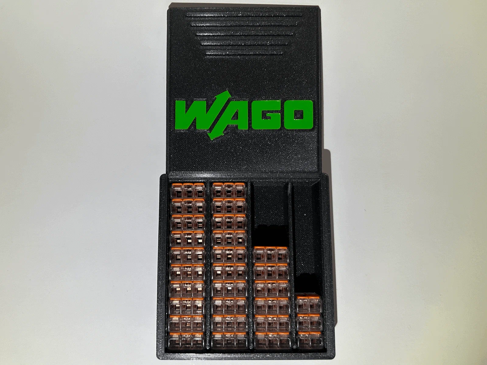 Hộp này được thiết kế cho đầu nối loại 2 và 3 dây (30x WAGO 221-413 và 10x WAGO 221-412). Nếu bạn muốn mang theo thêm loại 5 dây, bạn có thể xếp 2 hoặc 4 cái mỗi hàng.