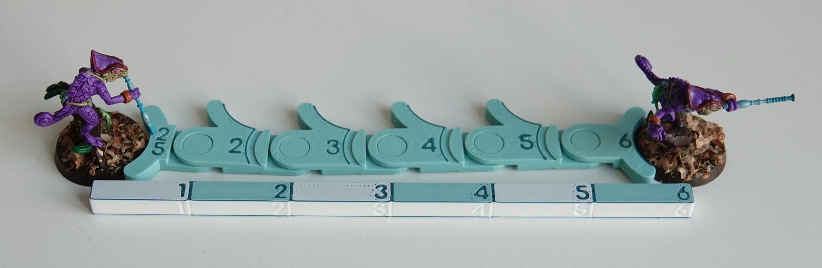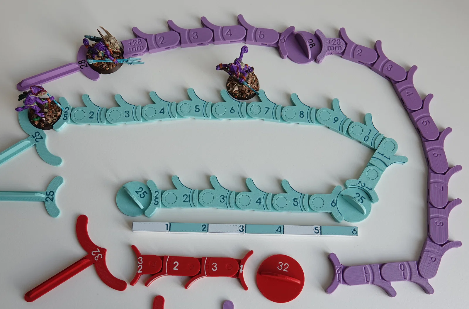 Bộ thước đo khoảng cách mép-đến-mép theo hướng trước-ra-sau cho miniatures, đã tính luôn đường kính base. Có bản cho base 25/28/32mm với thước 4, 6 và 12 inch; có file 3mf và tuỳ chọn lắp ráp hoặc print-in-place.