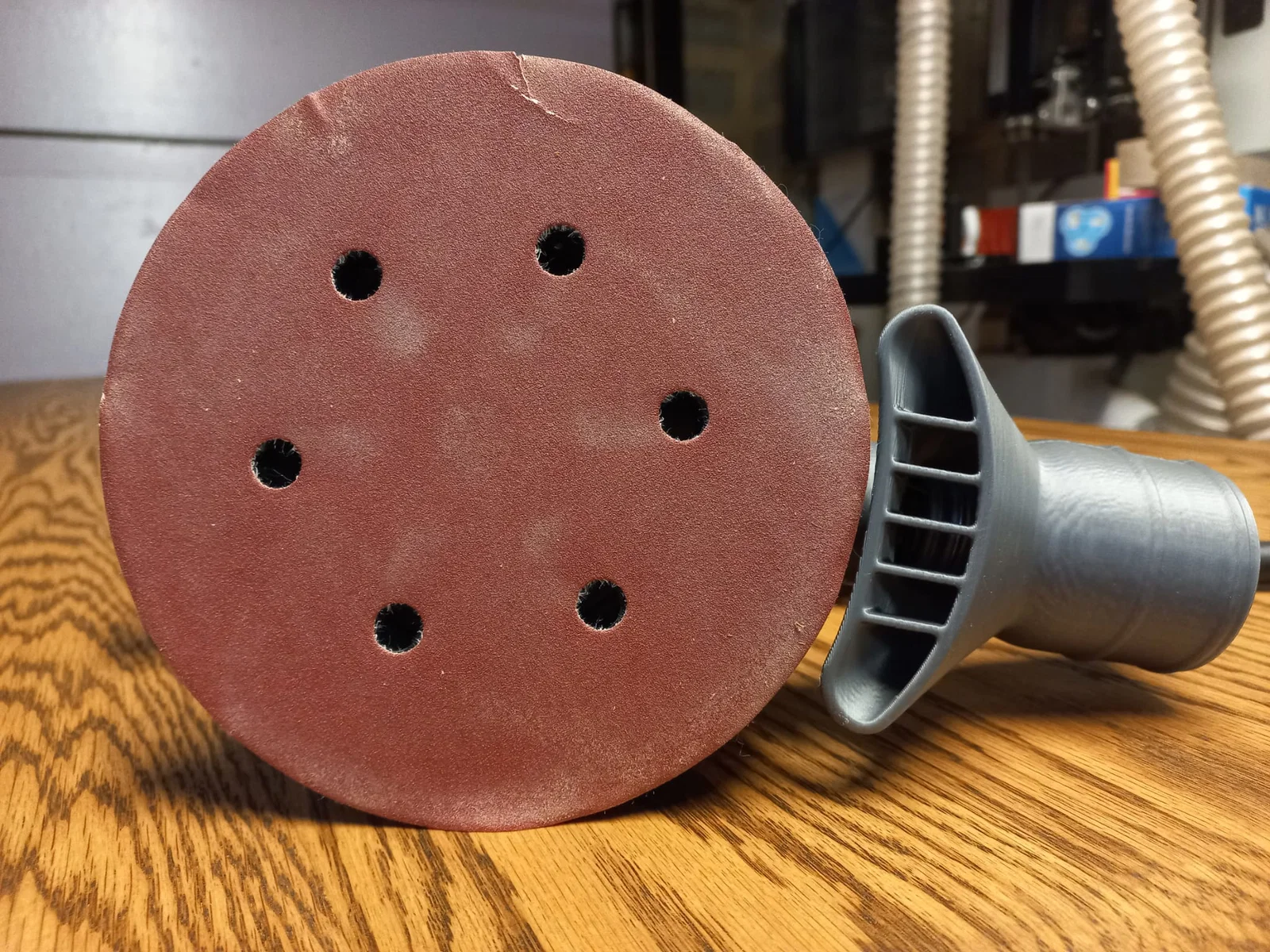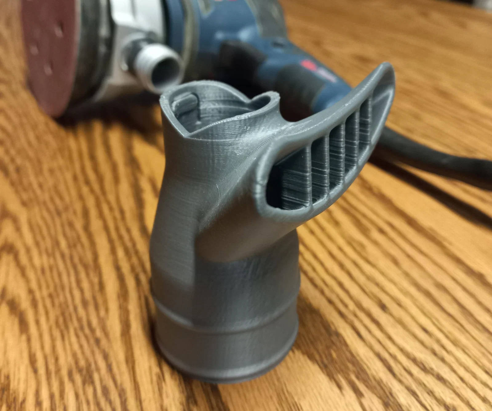Dust collector/adapter cho BOSCH GEX 125-150, thiết kế để gắn với ống DN50 spiral hose và có thêm bề mặt thu bụi giúp hút sạch bụi còn lại trên bề mặt làm việc. In tốt bằng PLA, gần như không cần support.