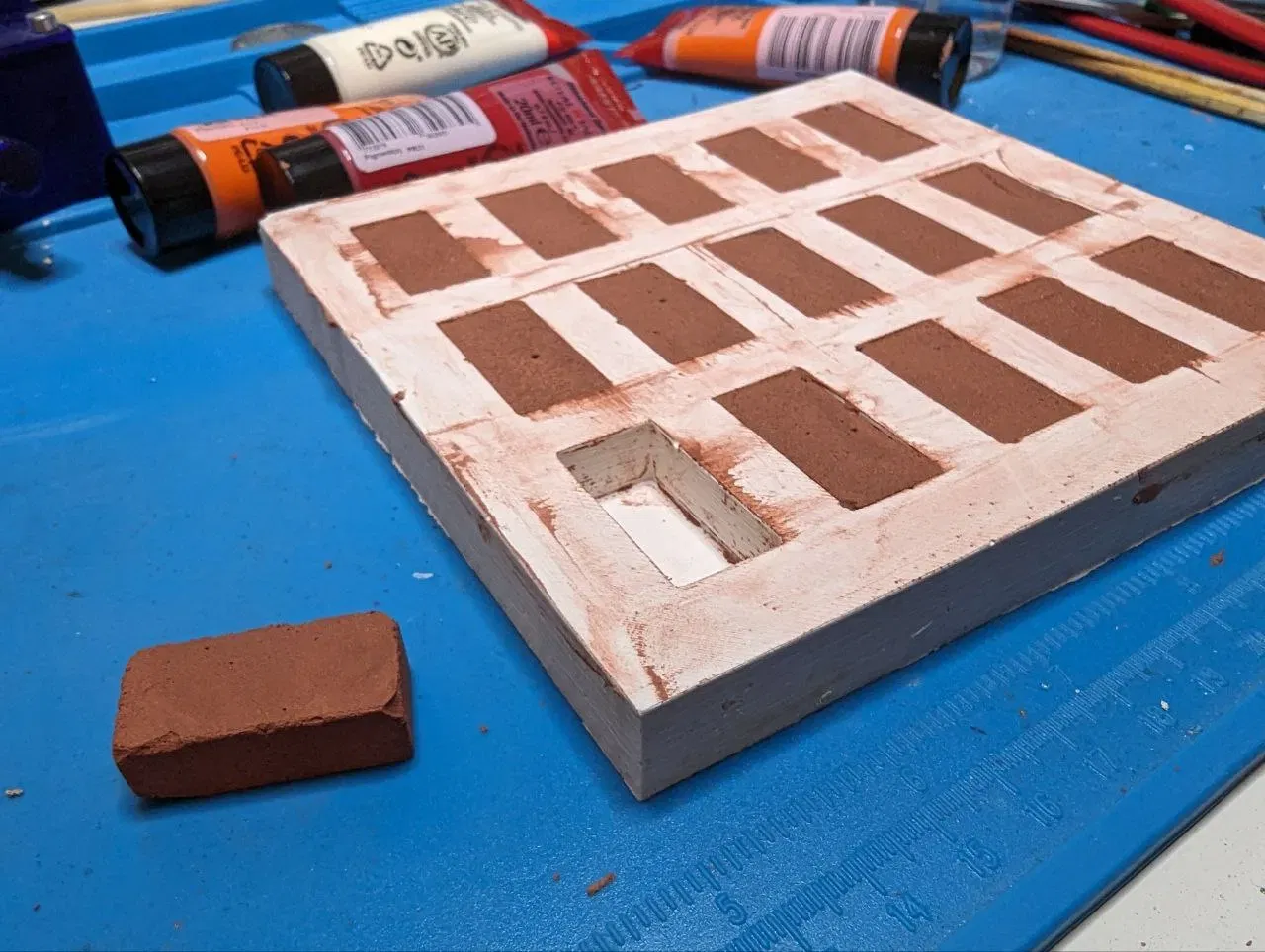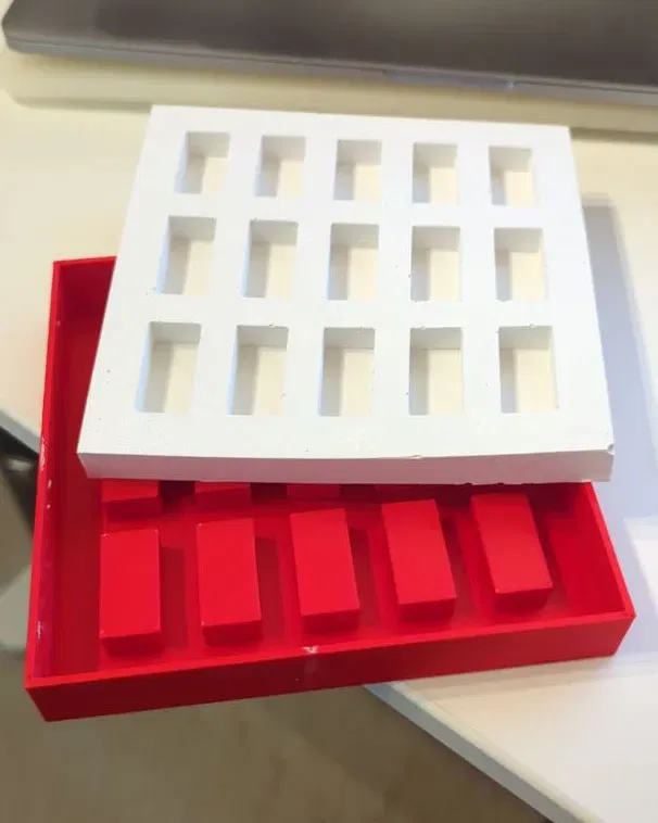 Đây là một khuôn ngược cho gạch mini. Tôi đã in khuôn bằng PLA màu đỏ và đổ đầy nó bằng silicon khuôn (màu trắng). Với khuôn silicon, tôi đã tạo ra những viên gạch đá mini có màu sắc khác nhau cho một khu vườn cổ tích.