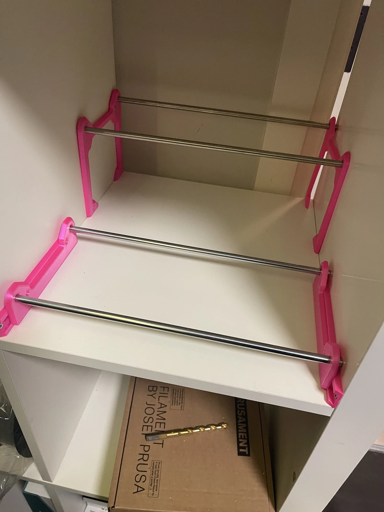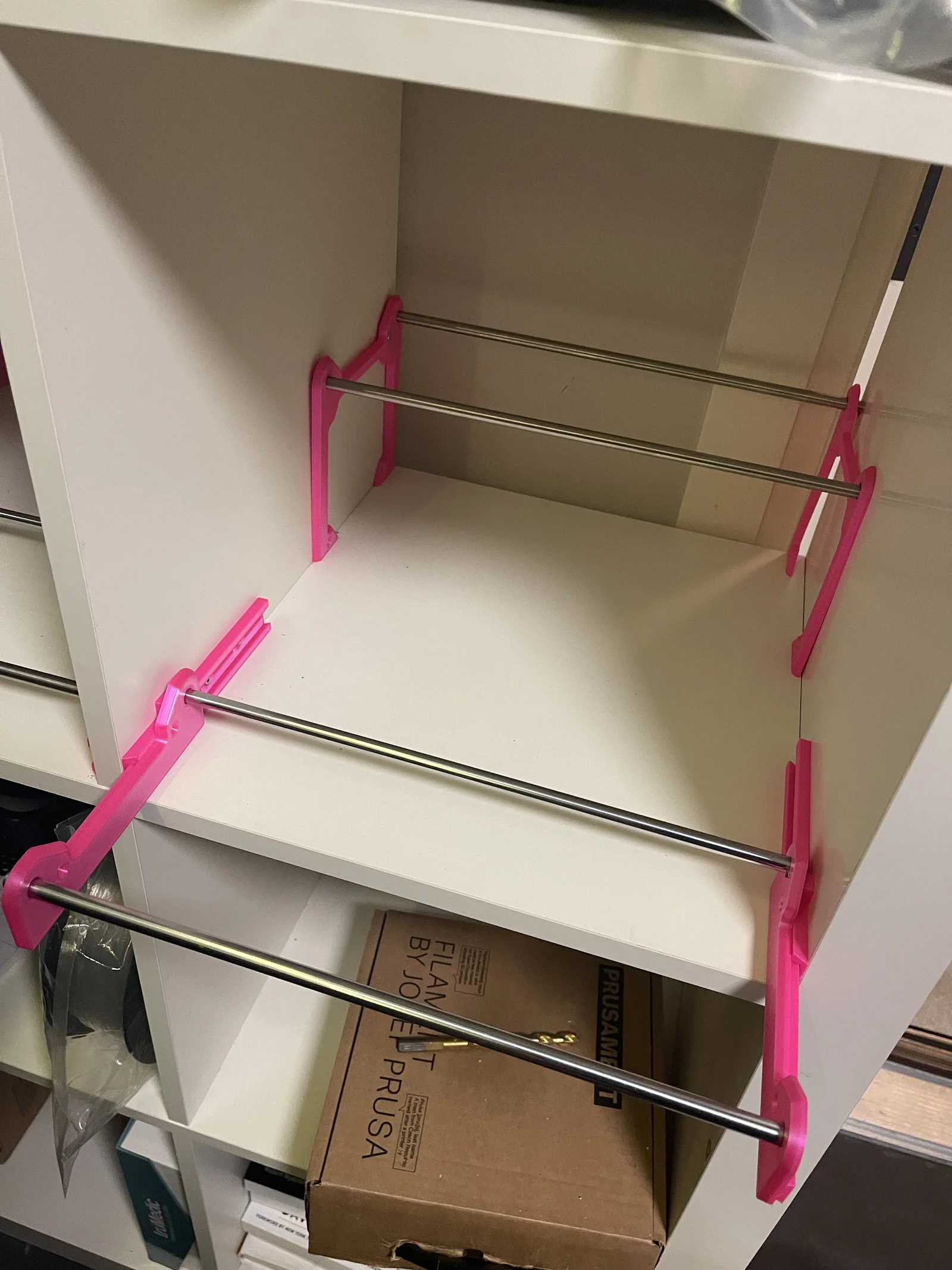 Bản remix cho IKEA Kallax Filament Storage Rack Slideout: thêm rail trượt ở các ngàm phía trước để dễ lấy cuộn filament phía sau mà không phải dỡ cuộn phía trước, đồng thời thu hẹp khoảng cách phù hợp với thanh thép 1m cắt làm 3.