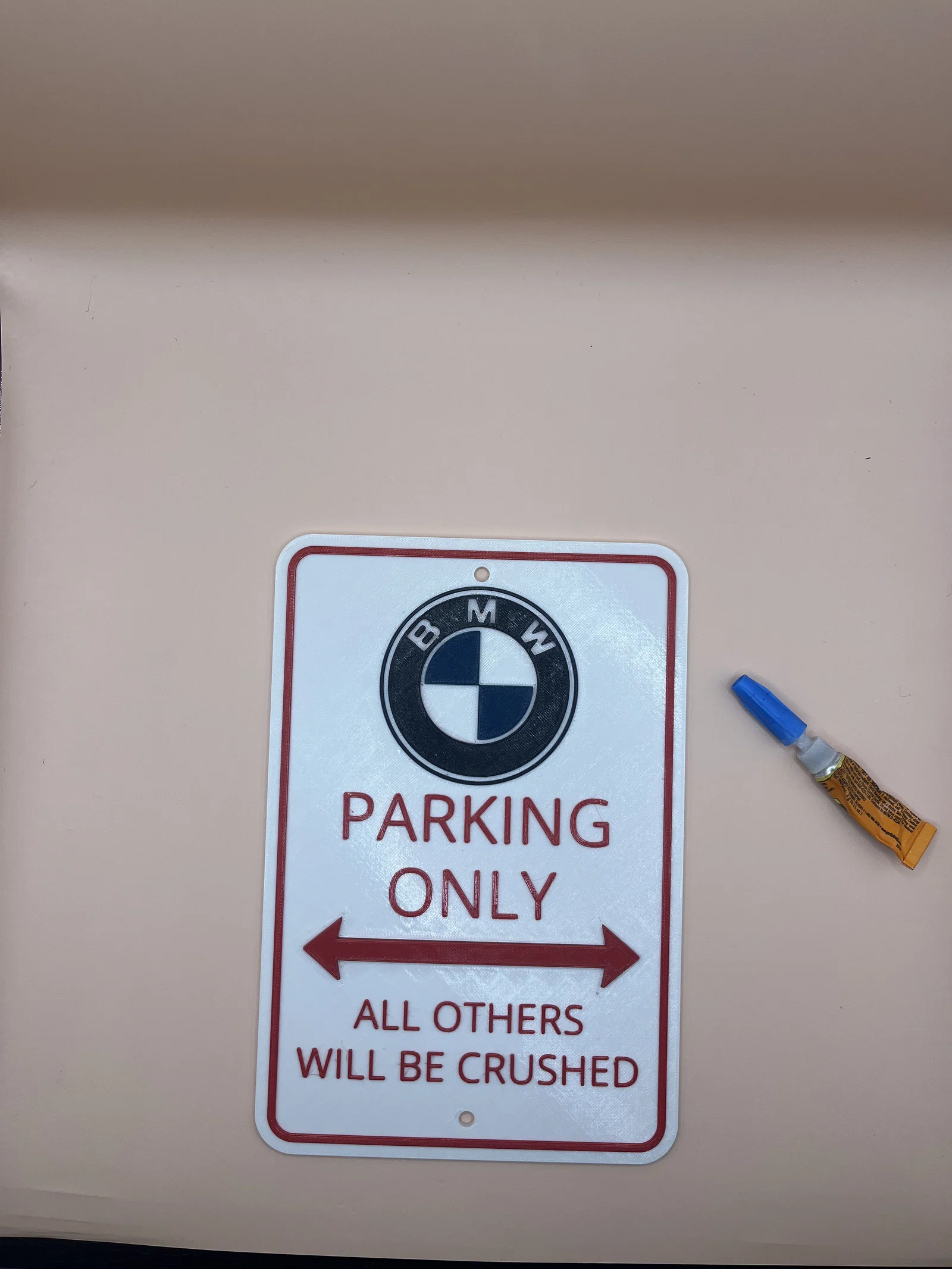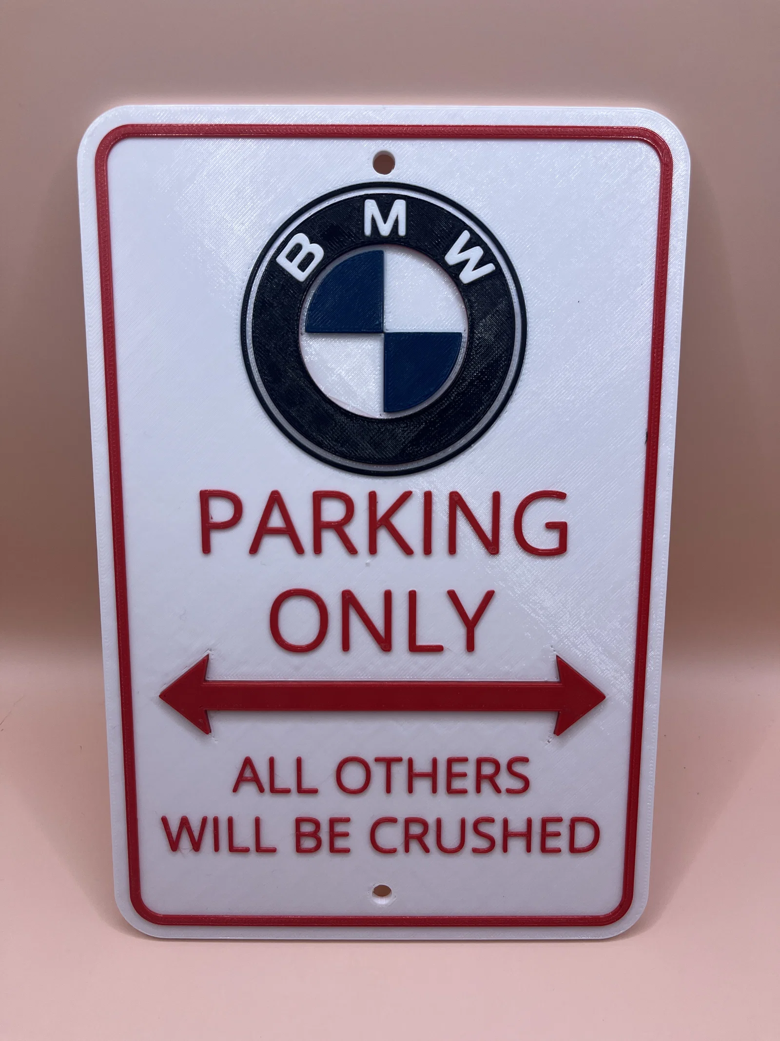 Bảng “BMW Parking Only” dạng hài hước, có thể in nguyên khối (combined) hoặc tách phần để lắp ráp. Tác giả in layer 0.3mm với PETG trong enclosure và dễ dàng ráp các chi tiết, phù hợp làm quà cho fan BMW.