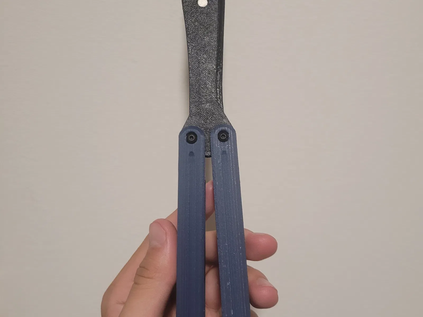 Một con balisong M3 mà tôi thiết kế trong Blender. Lưỡi dao được hiển thị là một bản sao rõ ràng của kiểu lưỡi dao Medusa của Fellowship Blades. Tôi không sao chép kích thước, chỉ sao chép hình dạng. Tôi đã in lưỡi dao bằng California Filament Black PETG và tay cầm bằng Eryone Matte Navy Blue PLA.