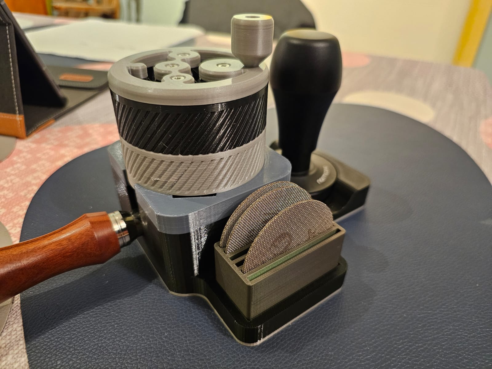 Mẫu tamping station để giữ NOTSEK 54mm Bottomless Portafilter, Normcore 53.3mm Spring Loaded Tamper và giá puck screen 54mm. Phần trên còn vừa WDT Umikot 54mm có lugs, tiện thao tác mà không cần nhấc portafilter ra.