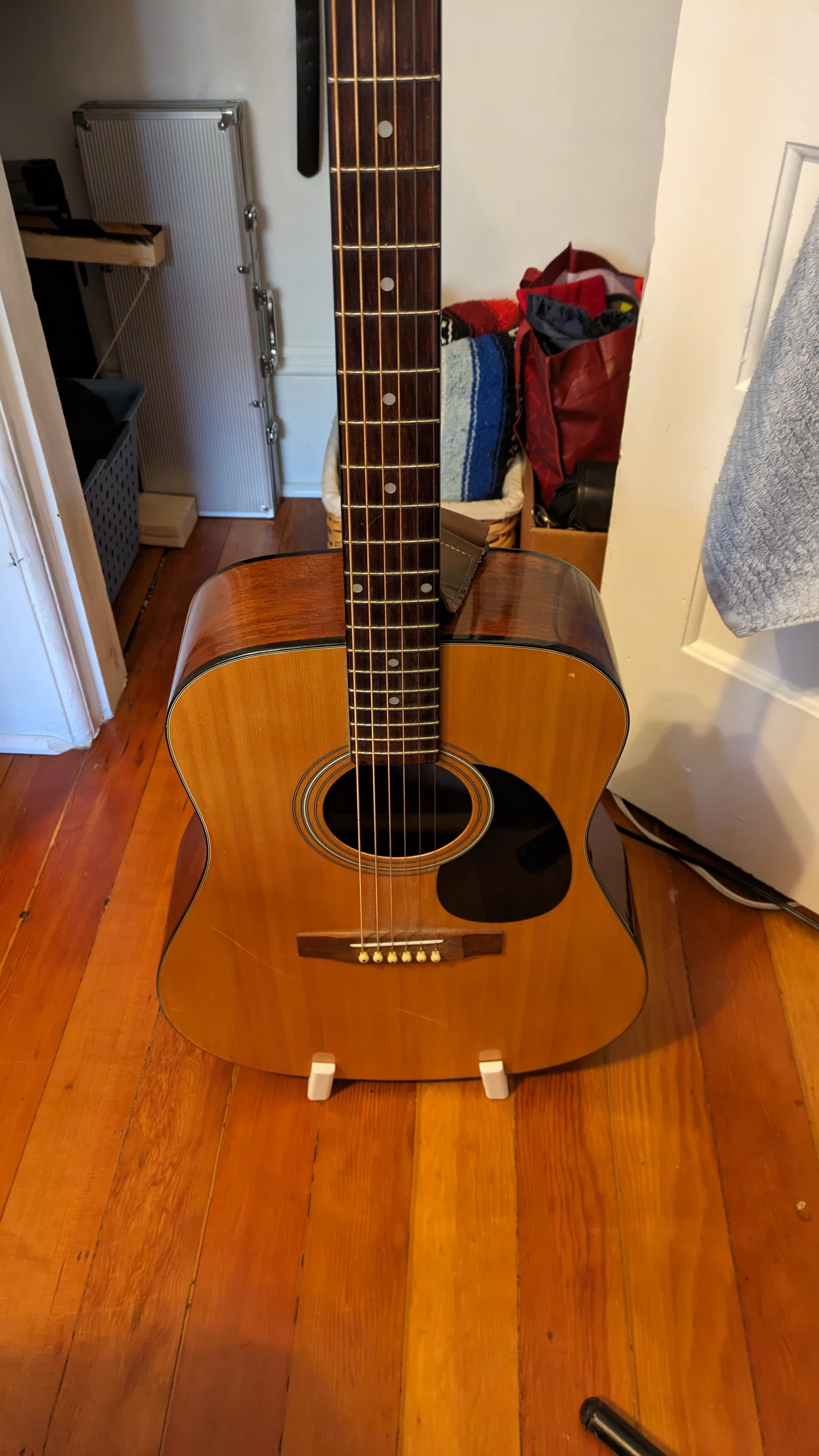 Đây là một cái chân đỡ dạng đứng tự do (free-standing) cơ bản cho đàn guitar acoustic. Không có gì phức tạp đâu, mình chỉ muốn có cách dựng cây đàn ở góc phòng ngủ cho gọn. Thành phẩm khá vững và nhìn cũng đẹp!