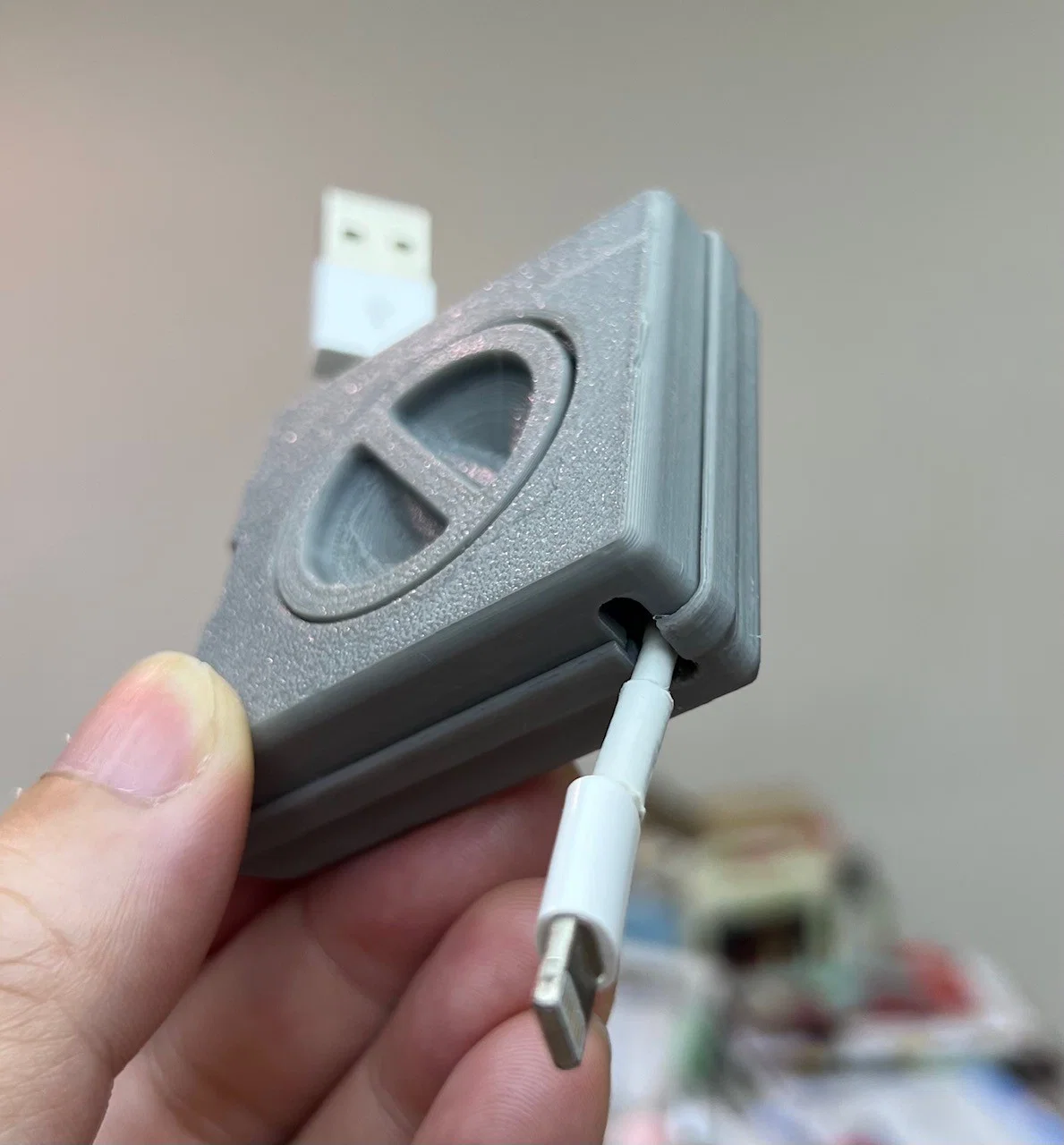 Hộp thu gọn dây điện thoại di động in 3D dạng in liền khối, có bản lề và núm xoay, không cần lắp ráp hay support. Mở hộp, đặt dây vào núm rồi xoay để cuộn dây vào trong. Khuyến nghị layer 0.15mm, infill 100%.