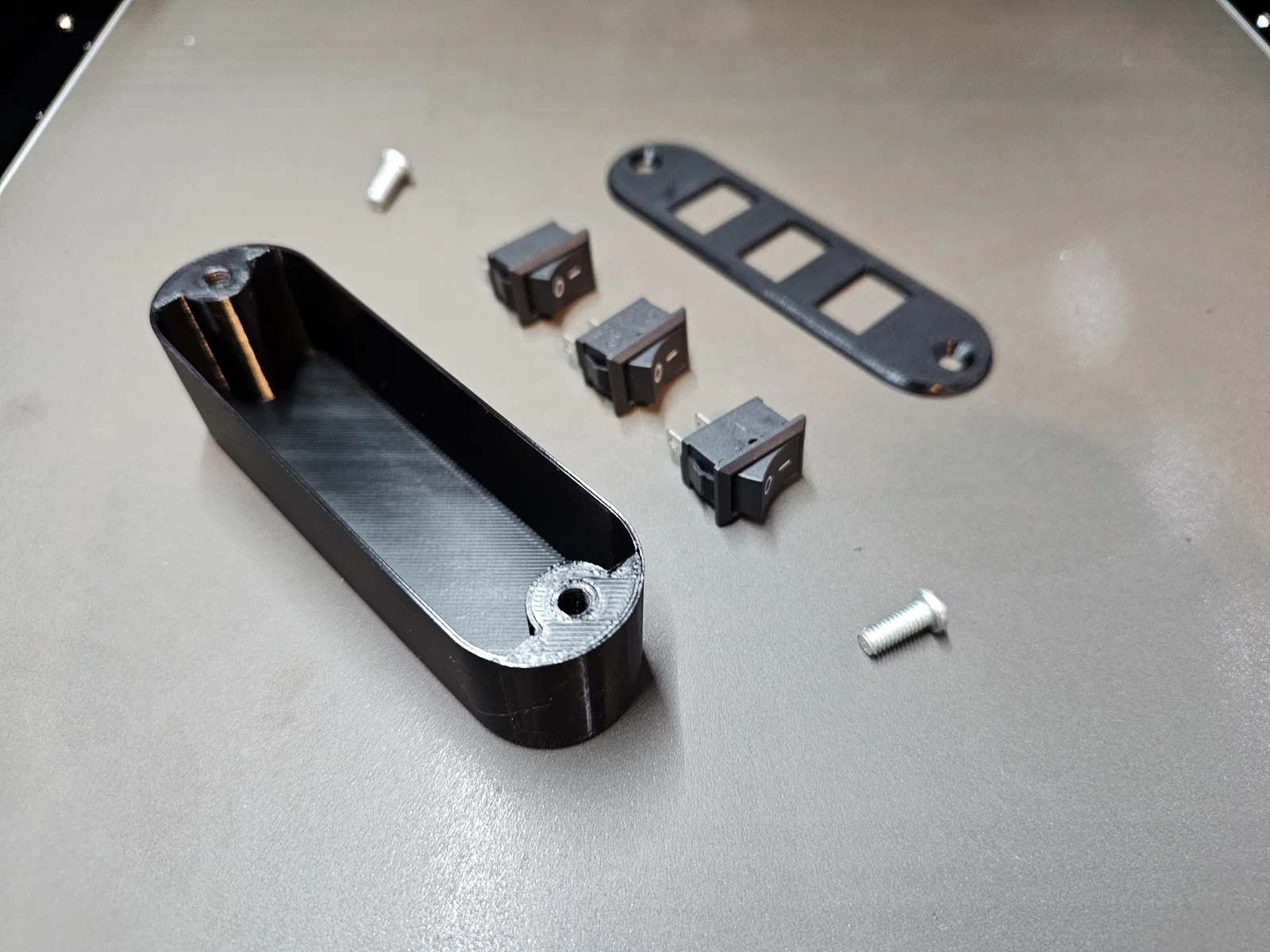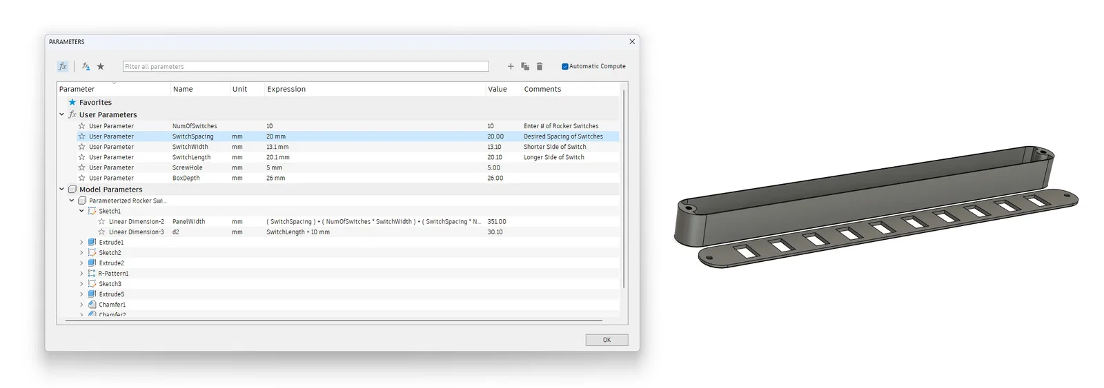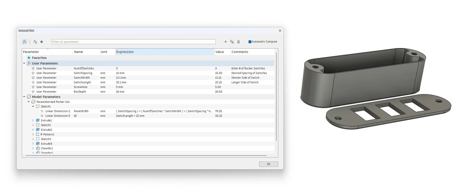 Mẫu Parameterized Rocker Switch Cover Plate and Box cho phép tùy chỉnh kích thước bằng parameters. Có kèm file .f3d và .step để chỉnh sửa, phù hợp làm hộp/nắp cho rocker switch, dễ điều chỉnh khoảng cách và lỗ bắt vít.