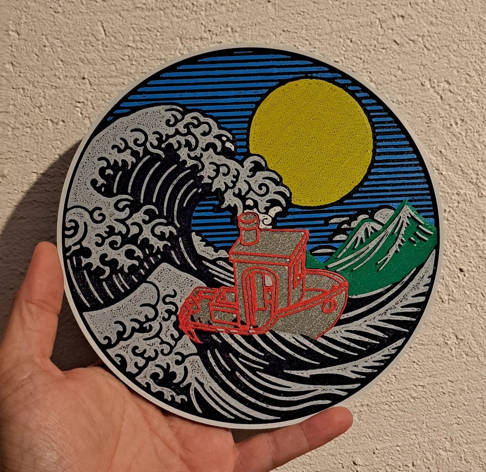Bản remix sóng Kanagawa kết hợp benchy, đã được làm lại và tô màu để in multicolor không cần MMU. Chỉ cần đổi màu sau mỗi 2 lớp. Có cập nhật 22-04 để sửa lỗi lớp cuối. Dùng Paint, web lithophane và PrusaSlicer.