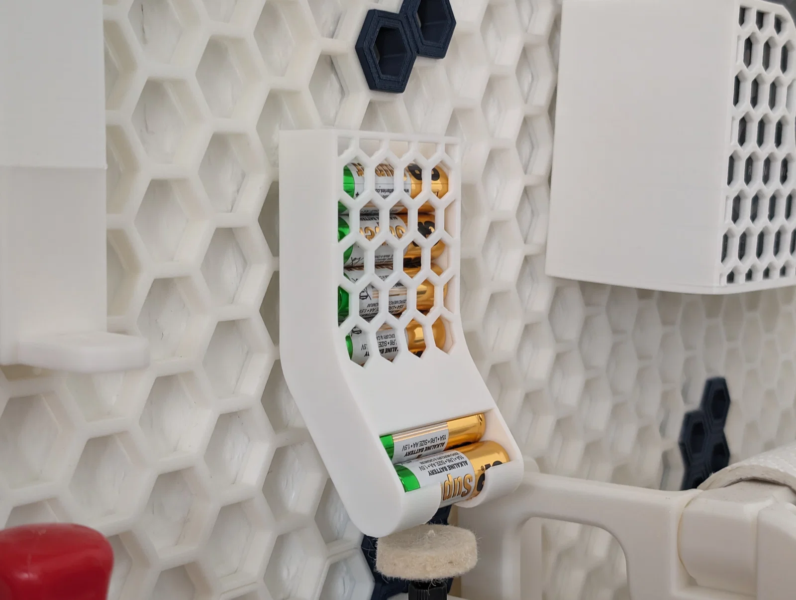 Bộ nhả pin in 3D gắn trực tiếp lên Honeycomb Storage Wall (HSW), giúp khu vực làm việc gọn gàng. Có 2 phiên bản cho pin AA và AAA, thiết kế first-in, first-out để luôn lấy pin cũ trước.