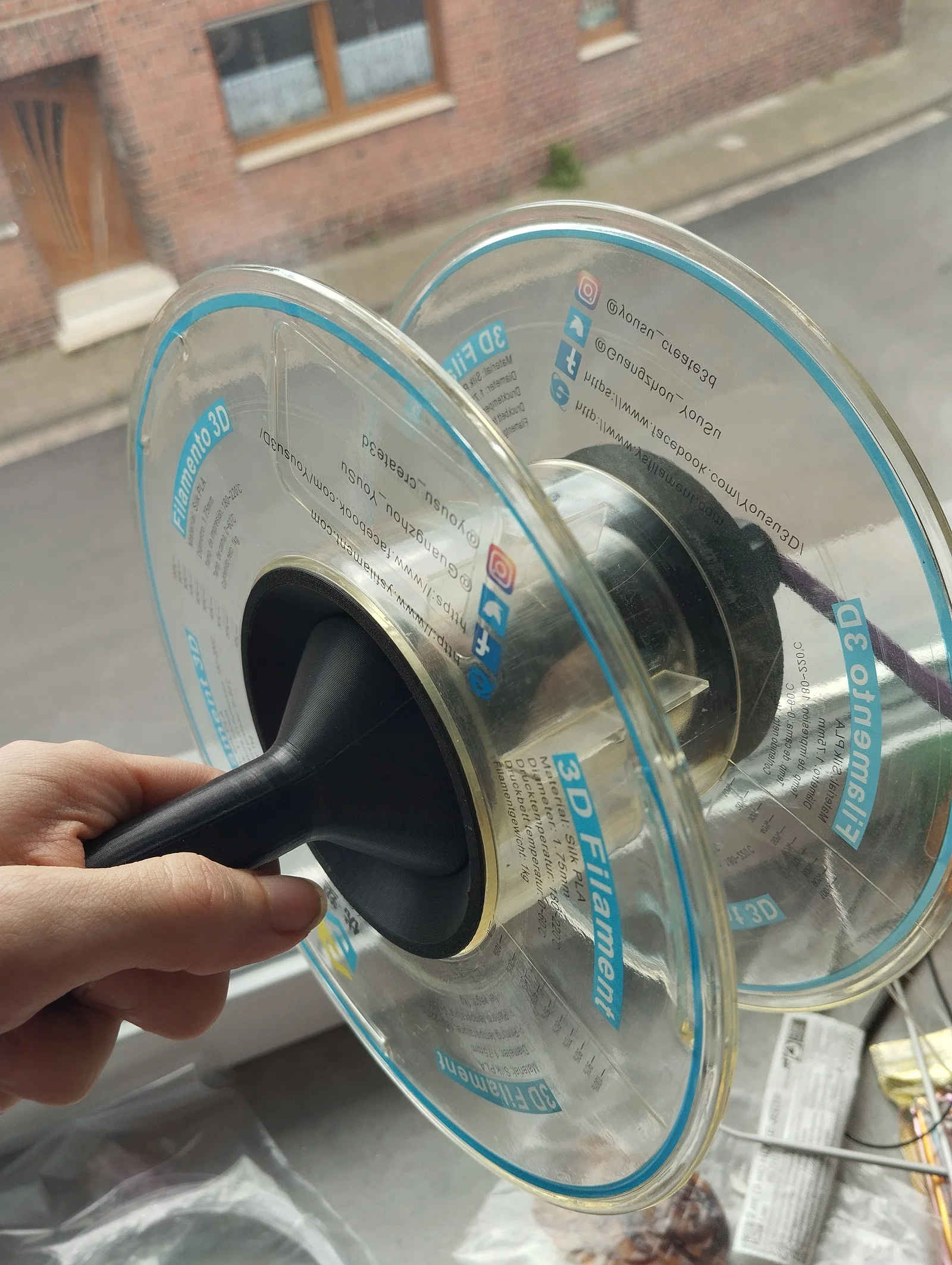Mình gặp vấn đề là một số cuộn filament của mình có lỗ tâm đường kính tới 85mm, làm cho trục pastamatic tiêu chuẩn bị tuột lọt qua lỗ này. Vì vậy mình làm nhanh một cái adapter để có thể respool qua lại với dạng cuộn này mà không gặp rắc rối gì. Không có gì “thần thánh” đâu: chỉ là đo lại các đường kính sẵn có và độ côn (gradient) của trục pastamatic, rồi mở rộng theo đó.