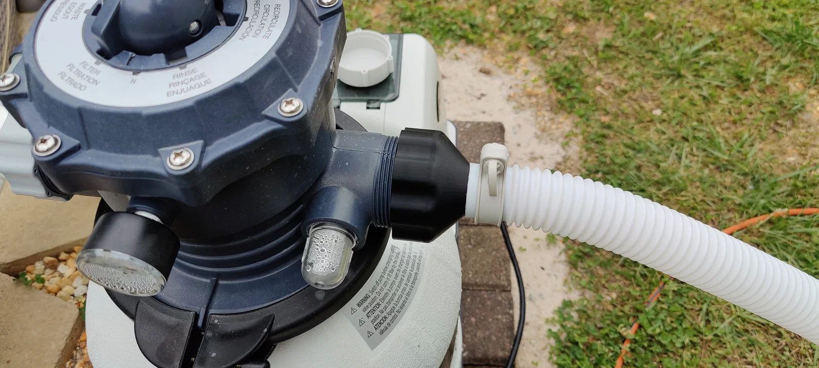 Adapter vặn vào waste port của van 6-way trên Intex sand filter để nối sang ống hồ bơi 1.25". Dùng dẫn nước xả/backflush ra xa hồ. Thông số ren OD 60mm 10TPI, góc ~60°. Khuyên in PETG, không cần supports.
