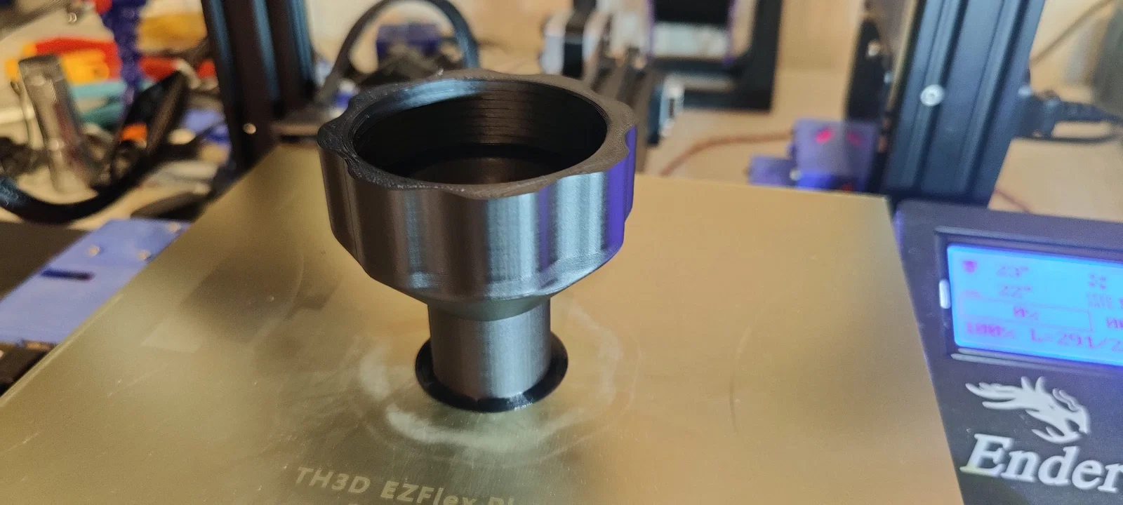 Mình tìm hoài không thấy mẫu nào ở đây hay ở mấy trang khác mà có thể vặn vừa vào cổng xả (waste port) trên bộ lọc cát Intex của nhà mình. Sau một hồi loay hoay (ren của Intex đúng kiểu “khác người”) trong Fusion và thử qua vài phiên bản, cuối cùng mình cũng làm ra cái adapter này. Nhờ đó mình dùng được ống hồ bơi 1.25" của đầu hút (vacuum) để dẫn nước xả (xả cạn, backflush, v.v.) ra xa khu vực hồ, tiện hơn nhiều.