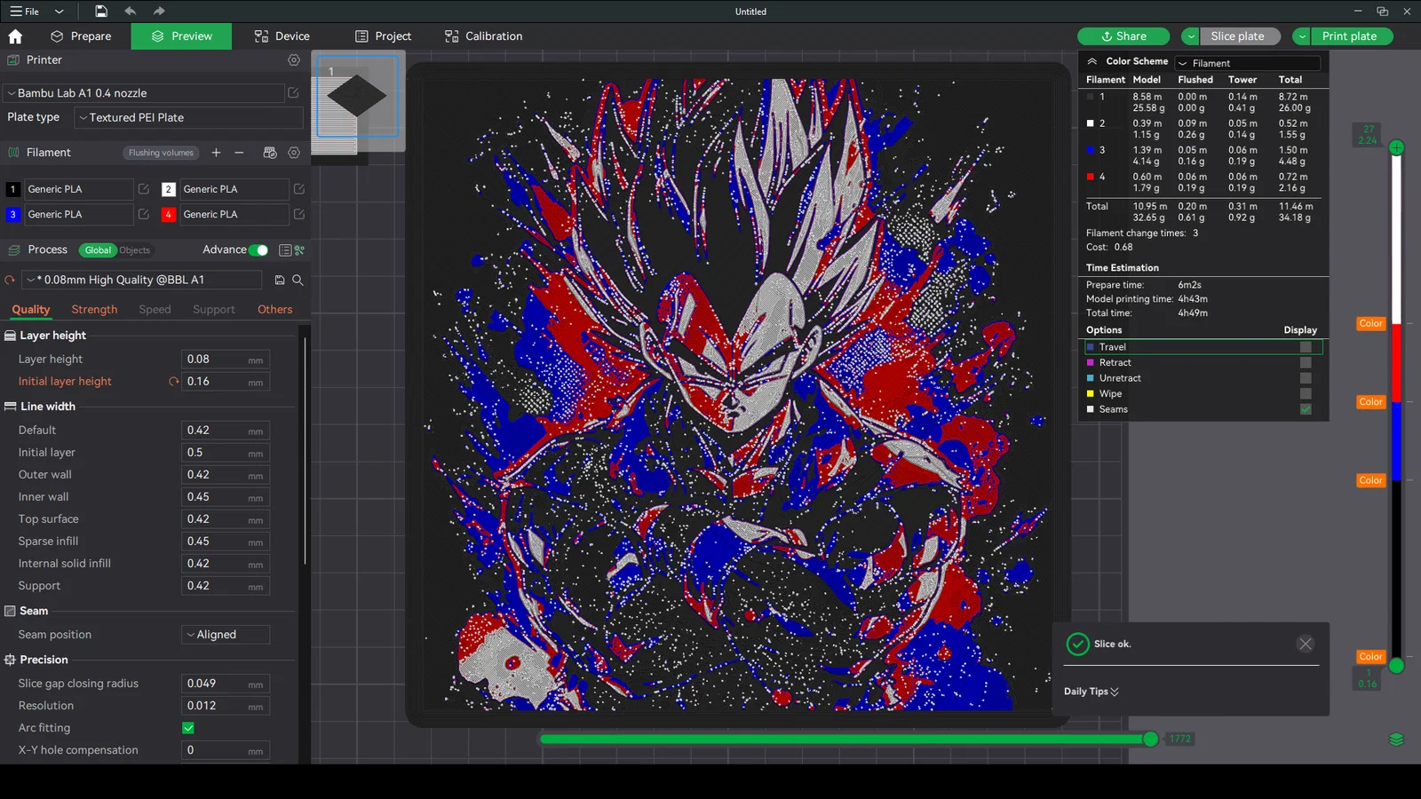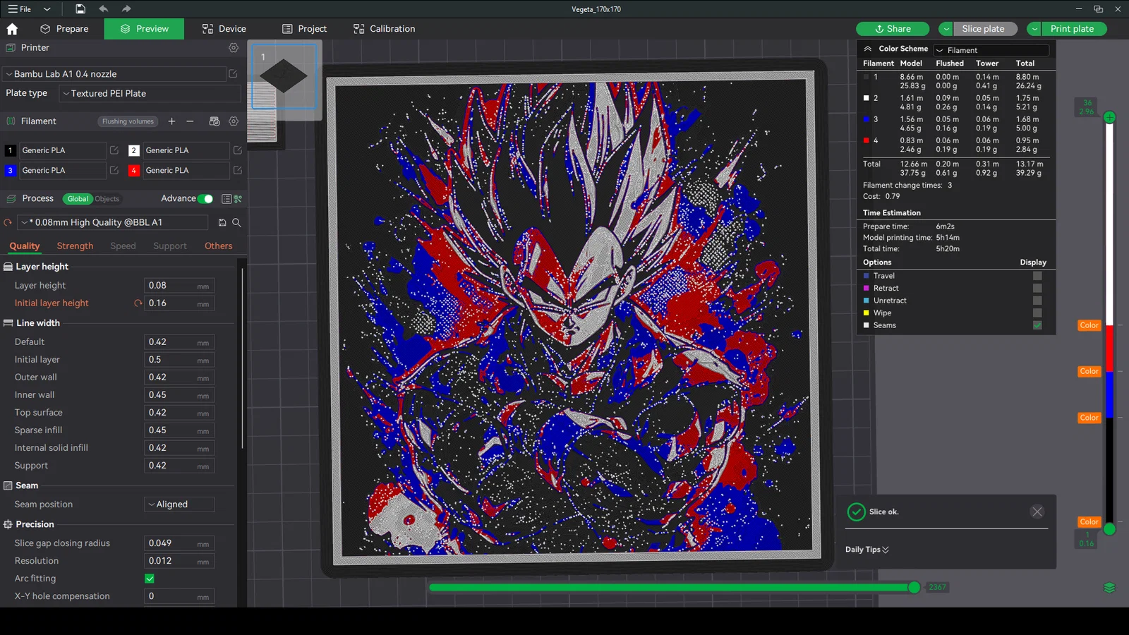 HueForge hình Vegeta (Dragonball) dạng wall art. Có thể chỉnh kích thước theo trục X/Y nhưng không đổi trục Z. In 100% infill, layer 0.08mm (base 0.16mm) và thay màu theo mốc layer được hướng dẫn.