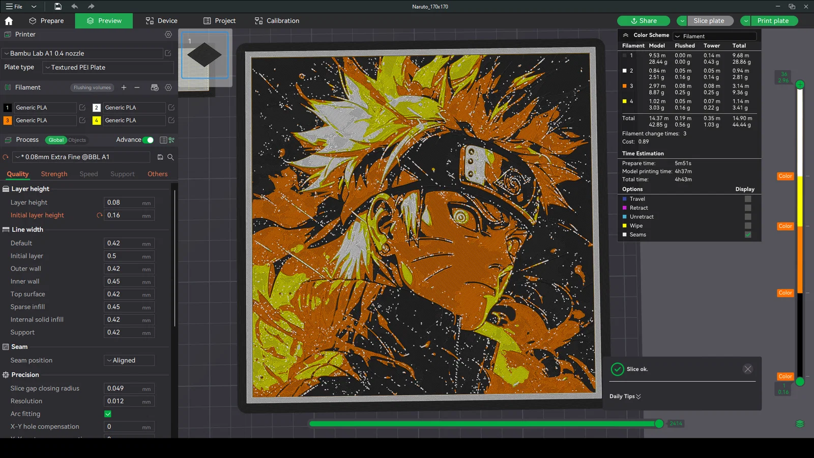 Mẫu HueForge Naruto dạng tranh 2D treo tường. Cho phép chỉnh kích thước trục X/Y nhưng không đổi trục Z. Hướng dẫn in: infill 100%, layer 0.08mm, base 0.16mm và đổi màu theo các mốc layer.