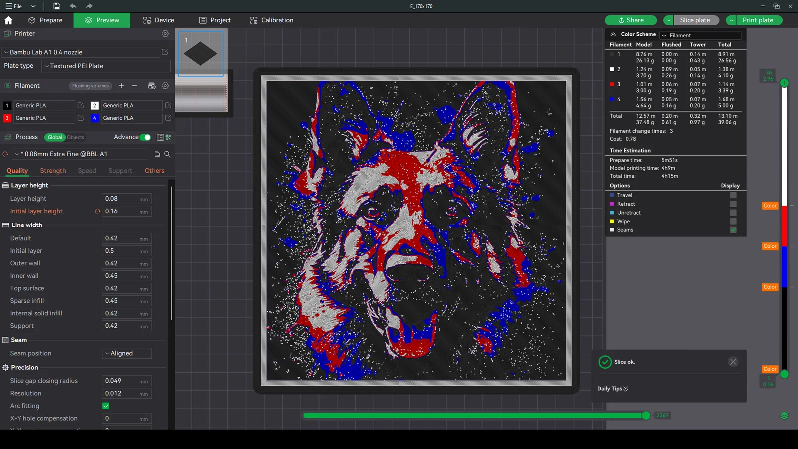 In ở 100% infill với layer height 0.08mm, base layer 0.16mm. Bắt đầu với Black Tới layer #11 (0.96mm) đổi sang Blue Tới layer #16 (1.36mm) đổi sang Red Tới layer #21 (1.76mm) đổi sang Jade White cho tới hết.