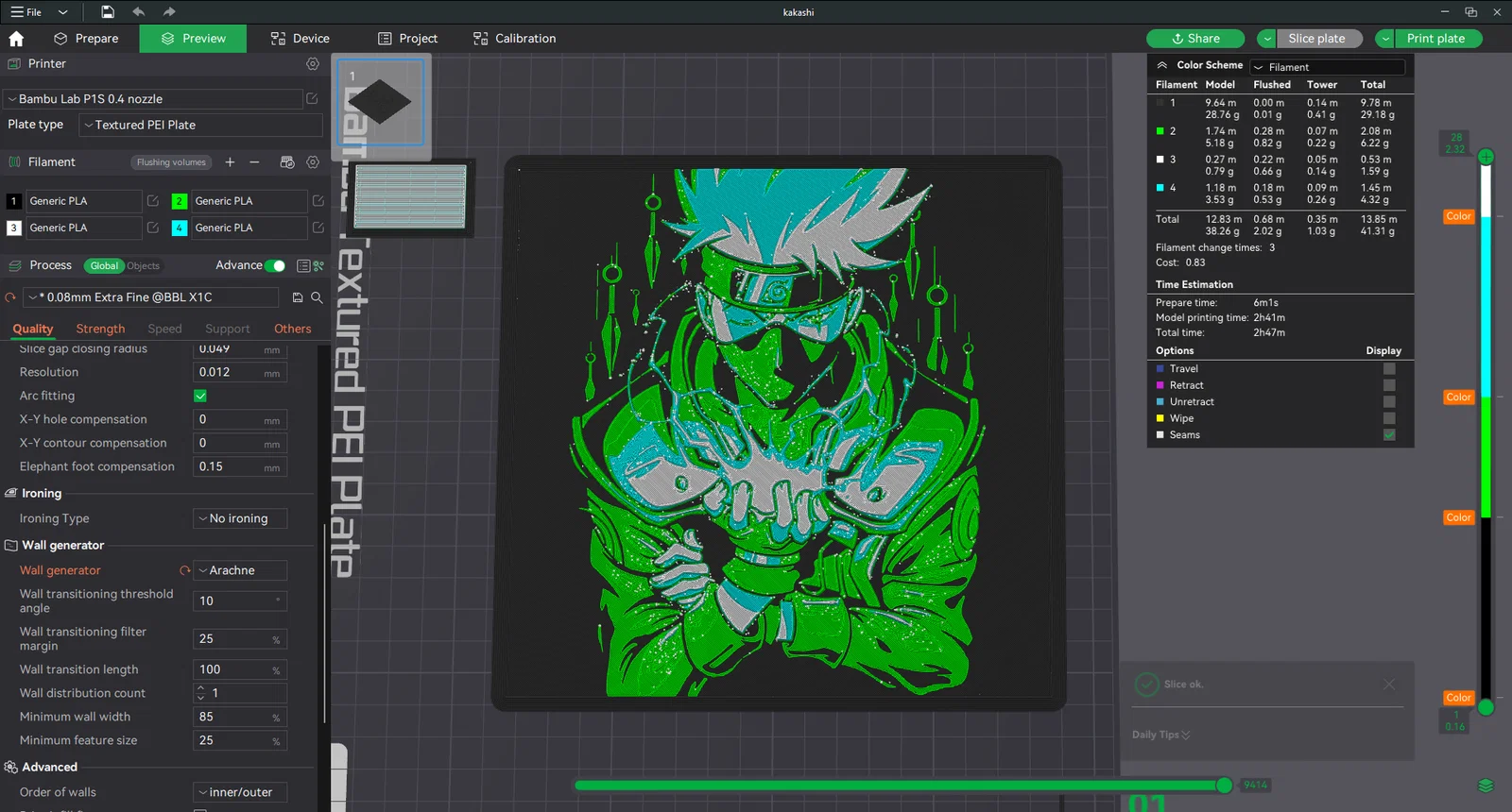 Mô hình Kakashi trong bộ phim Naruto được thiết kế theo phong cách HueForge độc đáo. Đây là tác phẩm nghệ thuật in 3D chuyển màu cực kỳ chi tiết, phù hợp để trang trí tường hoặc làm quà tặng cho các fan của series anime đình đám này.