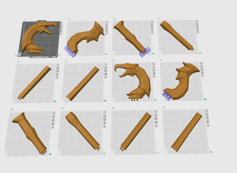 Được chia thành 12 đoạn để dễ dàng in ấn. Bạn nên dùng ít support hơn ở các tấm số 1, 2, 7 và 8 để giảm trọng lượng cho phần thân trên. Lưu ý là điều này không bắt buộc vì mẫu in trong ảnh thực tế đã dùng 15% infill cho toàn bộ các phần.