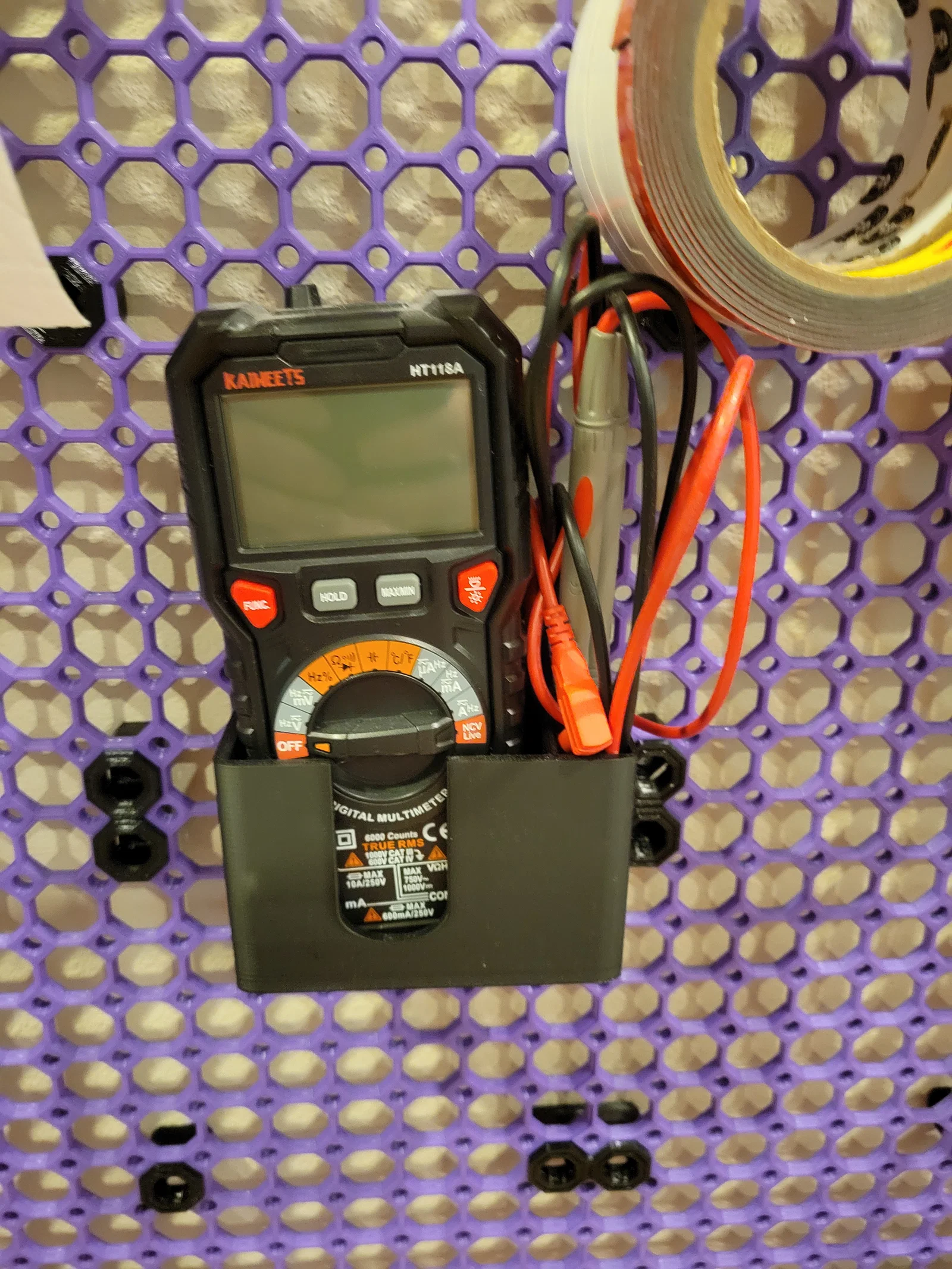 Mình muốn làm một cái giá treo đồng hồ vạn năng để tiện lấy ra sử dụng. Thiết kế có sẵn một khe để đặt đồng hồ và một khe để gác dây đo (probes).