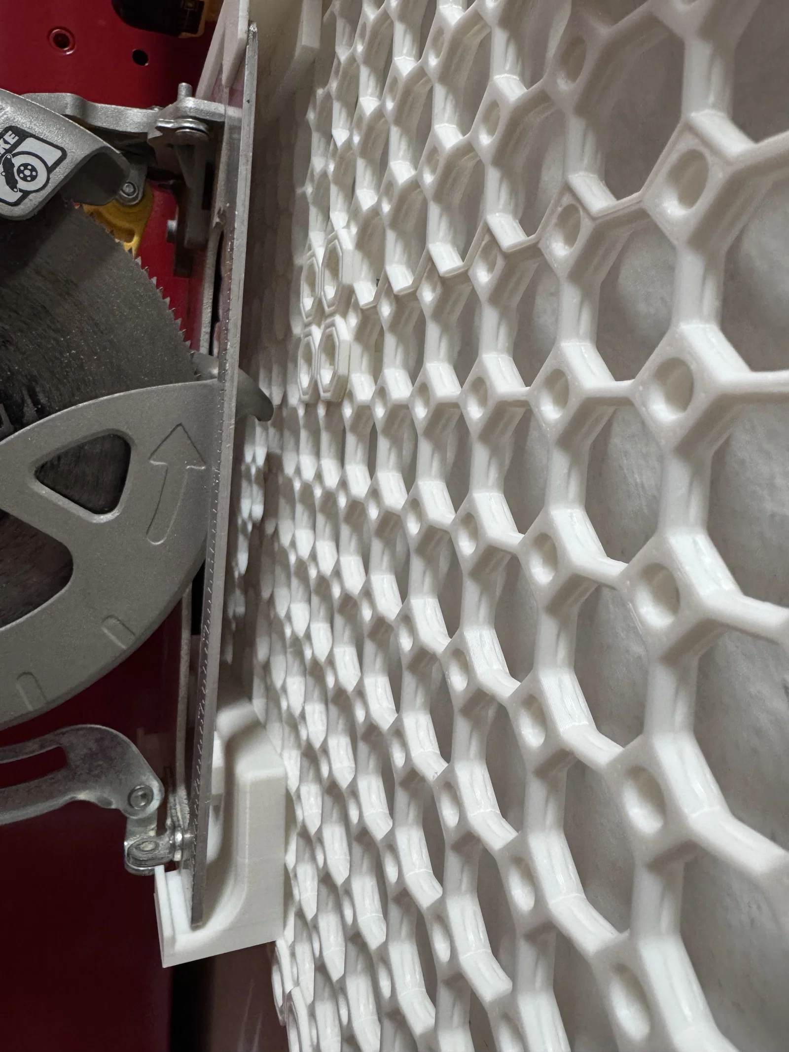 Tôi đã in cái này với một vài tinh chỉnh - in 3 lớp tường (walls) cho phần trên và 4 lớp cho phần dưới. Chi tiết này được làm dày có chủ đích để đảm bảo có đủ khoảng trống cho phần ốp bảo vệ của lưỡi cưa - tôi đã từng thấy vài thiết kế buộc phải khóa phần ốp đó lại và tôi thì không muốn phiền phức như vậy chút nào.