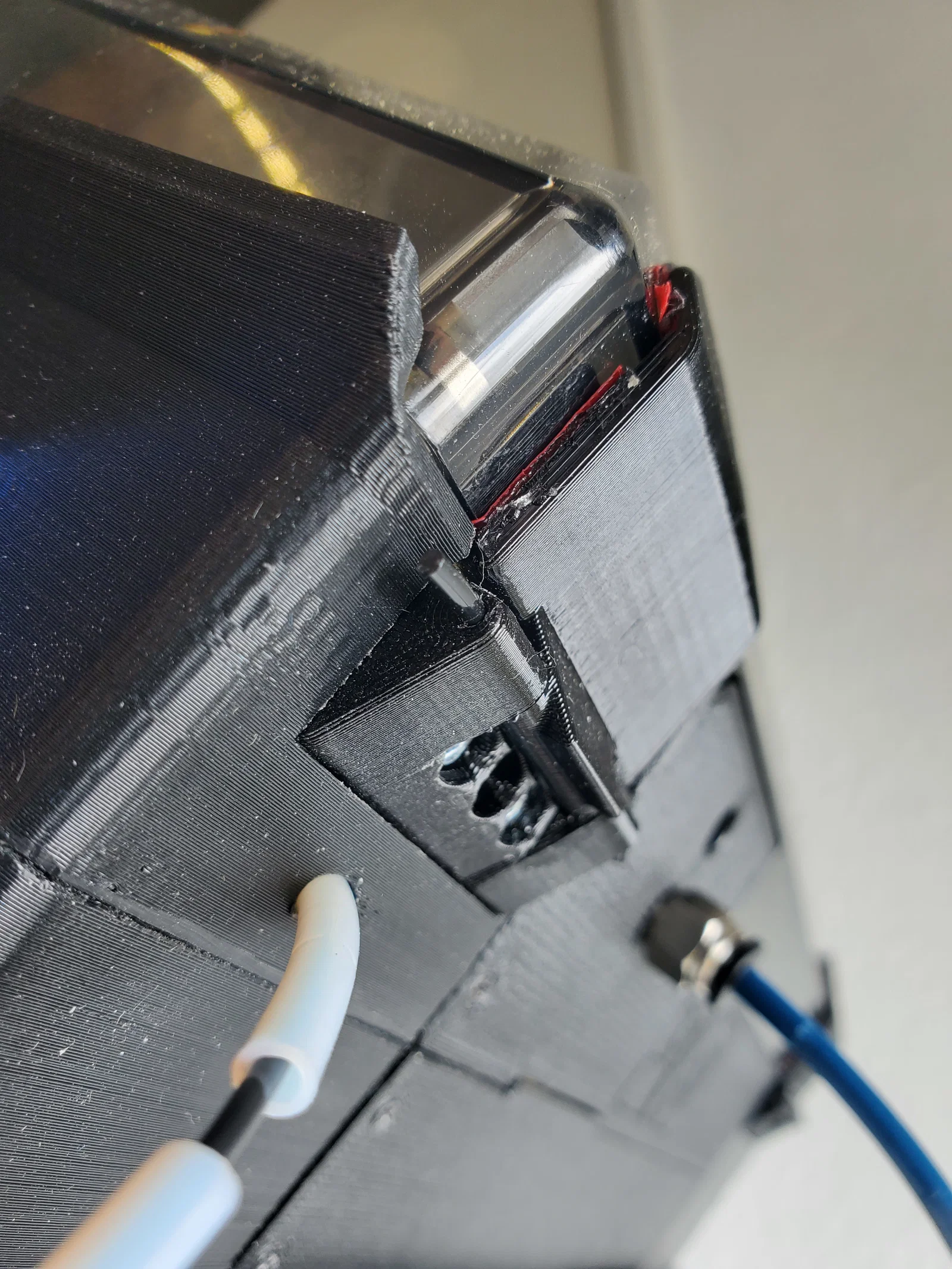 Phiên bản giá đỡ nắp cho Creality K1 có tích hợp bản lề và khe gắn đèn LED. Thiết kế thông minh sử dụng đai ốc đồng để tăng độ bền, tiết kiệm nhựa và hỗ trợ xếp chồng để tăng chiều cao nắp đậy.