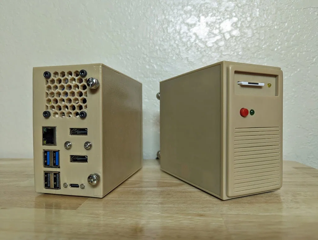 Một mẫu vỏ Raspberry Pi 5 dạng tháp (tower) màu be theo phong cách retro. Vỏ có nút power hoạt động được, LED nguồn, và LED báo hoạt động IO. Thẻ SD/microSD có thể đưa vào như “đĩa mềm” để đổi qua lại giữa các hệ điều hành khác nhau. Phía sau vỏ có 2 cổng HDMI, jack audio và cổng nguồn USB-C.