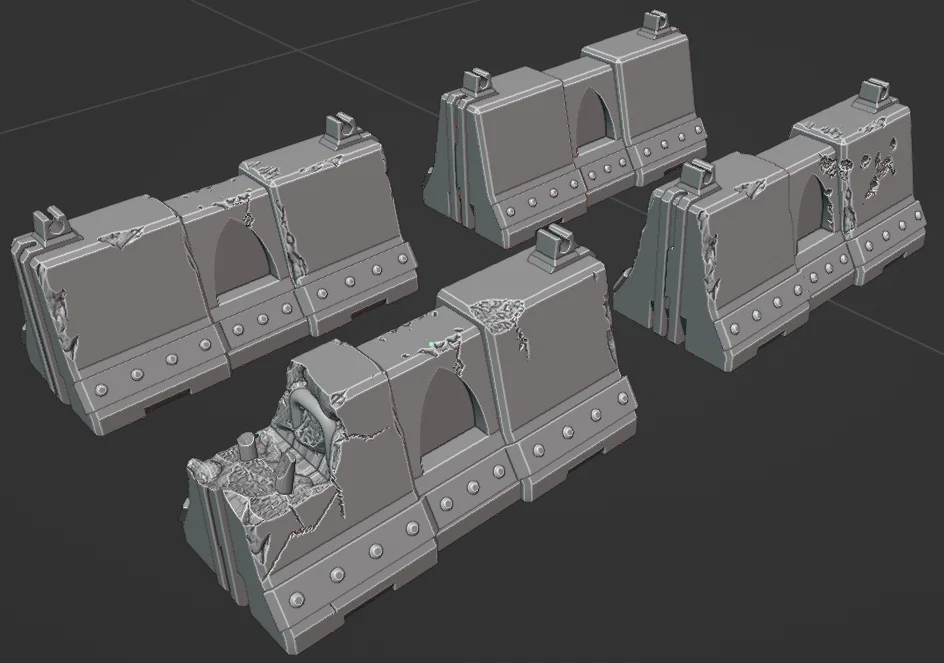 Bộ rào chắn bê tông in 3D phong cách grimdark pha chút gothic, gồm 4 mức độ hư hại để phối cảnh đa dạng. Chuẩn cho bàn wargaming 28mm như Warhammer 40k. In FDM ổn, không cần support.