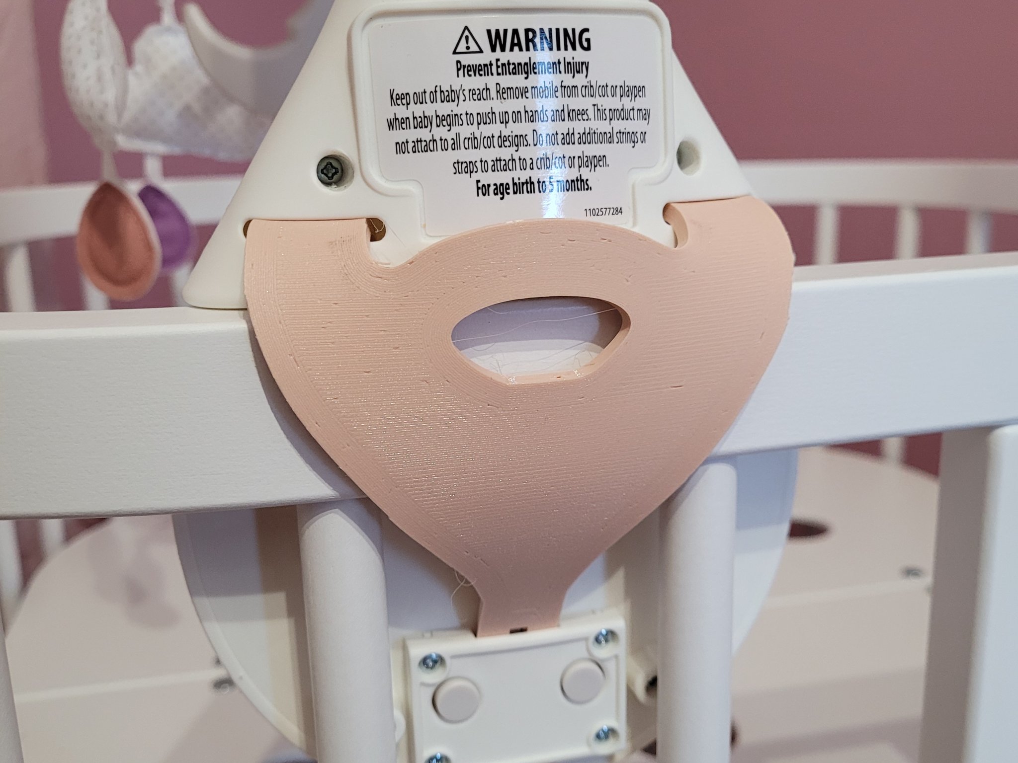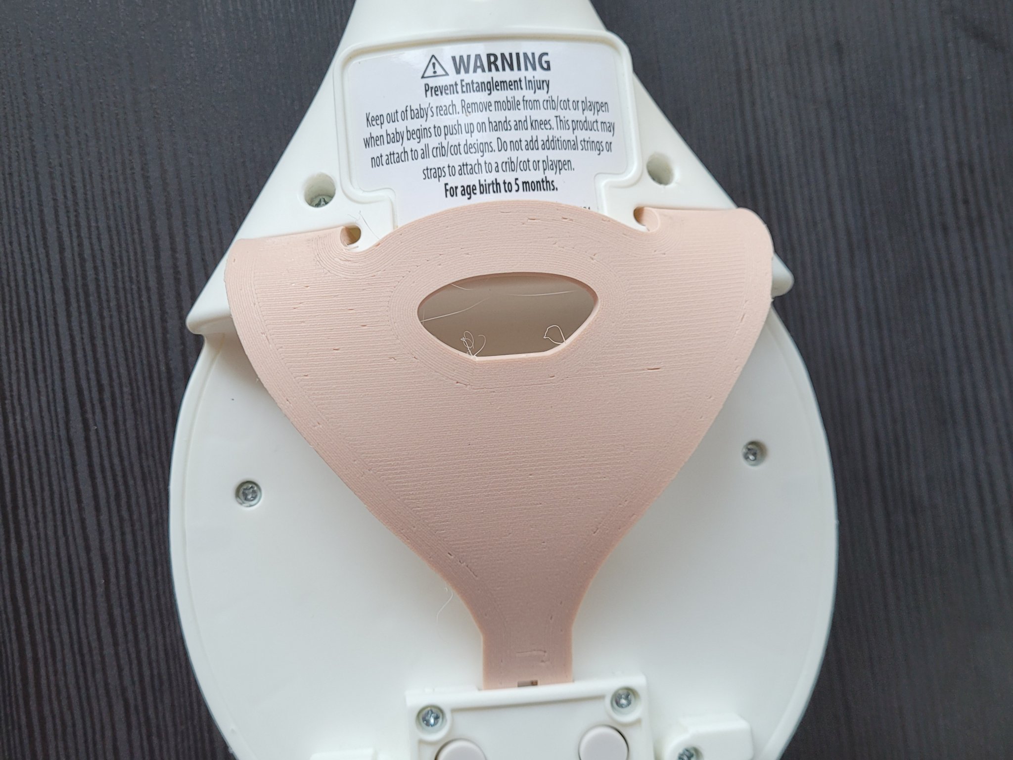 Tôi đã mua một cái máy làm dịu Fisher-Price đã qua sử dụng với, như đã xảy ra, dây đai khóa bị hỏng - phần được sử dụng để gắn toàn bộ máy làm dịu vào cũi. Như bạn có thể thấy trong ảnh của phần gốc, một lỗ giữ nó đã bị gãy, do đó nó khá lỏng lẻo khi được gắn.