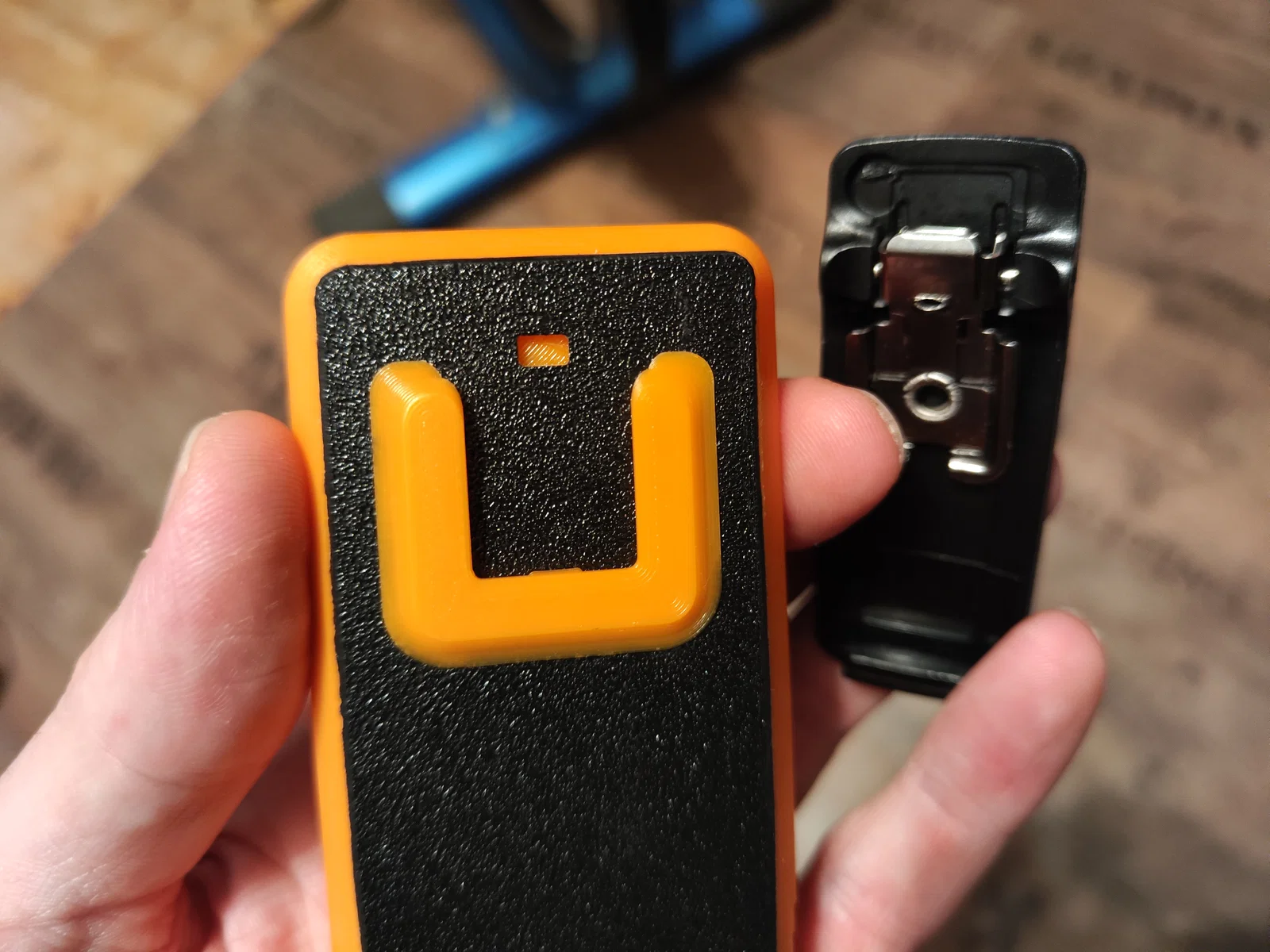 Vì mình không thích kiểu chỉ dán keo không, nên mình thêm một cái rãnh và các chốt (pins) cần được nung chảy sau khi đã dán và gắn lên phần base. Cách này tạo thêm liên kết cơ khí để tăng độ chắc cho ngàm belt clip — chỗ này bị tải liên tục do lò xo của belt clip zin.