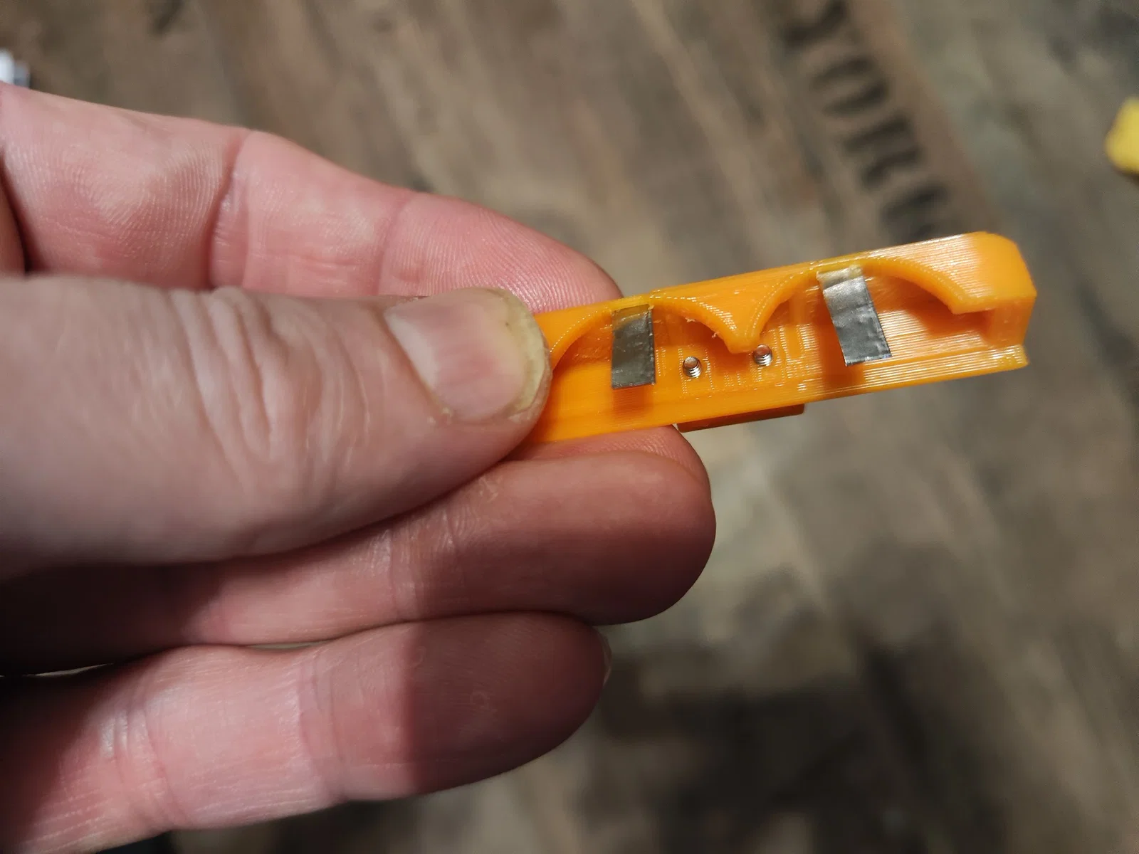 Pro Tip1: Dạo này mình rất thích dùng resin in 3D và đèn UV. Cách này giúp cố định nhanh các món vào đúng vị trí; chỉ cần vài giây chiếu UV là cứng ngay, tiện để canh chỉnh. Mấy đốm trắng bạn thấy trong vỏ là resin đã đóng rắn (white hardened resin). Thêm nữa resin không dẫn điện nên cũng rất hợp để cách điện cho các dải kim loại và điểm hàn.