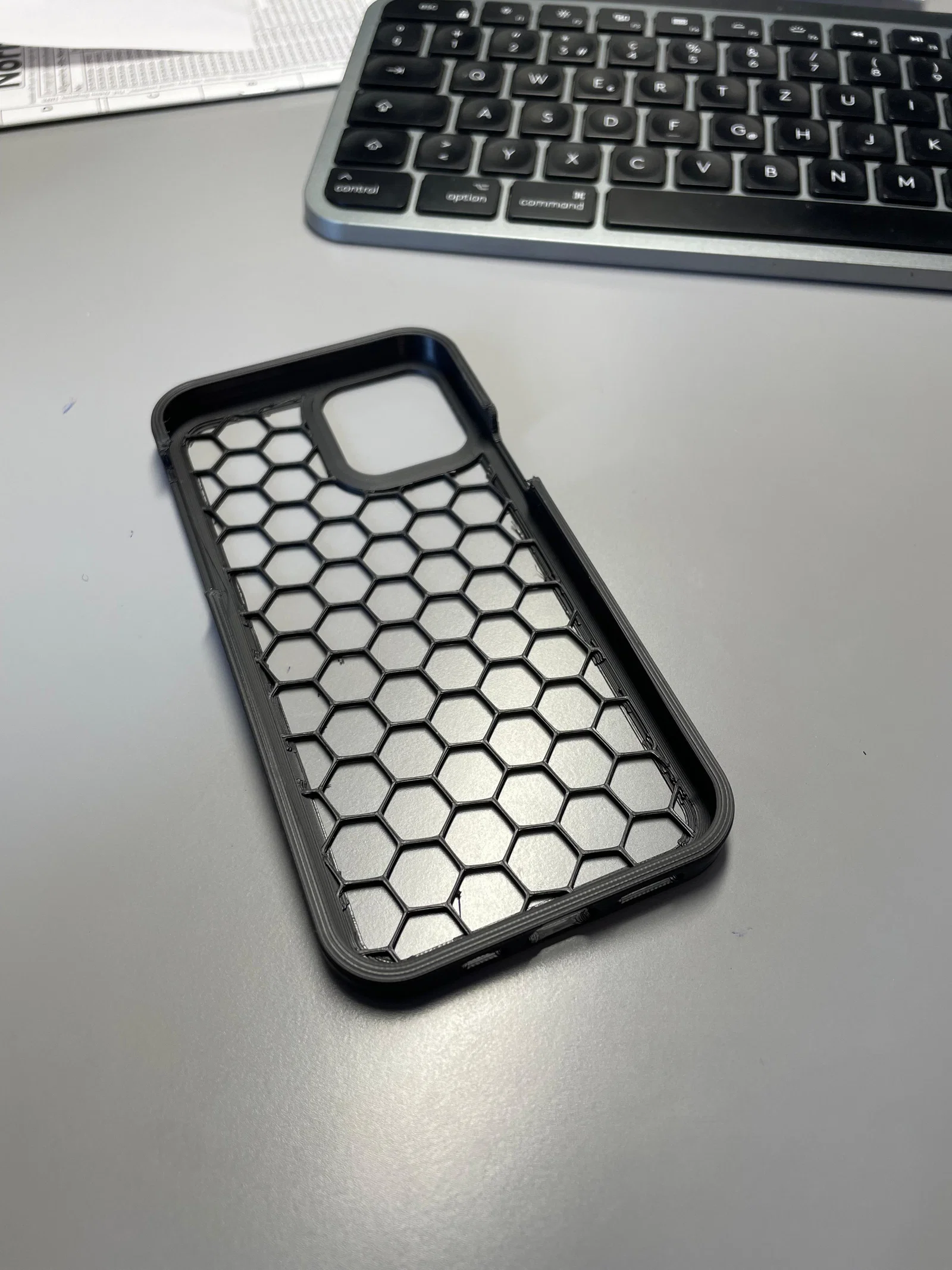 Mẫu ốp lưng iPhone 12 có khoét nút bấm, tối ưu để in bằng PLA, PLA+ hoặc PETG. Gợi ý tăng Z-scaling khoảng 103% để vừa máy hơn, kèm mẹo để lộ infill Honeycomb tạo họa tiết tổ ong và tăng độ bám.