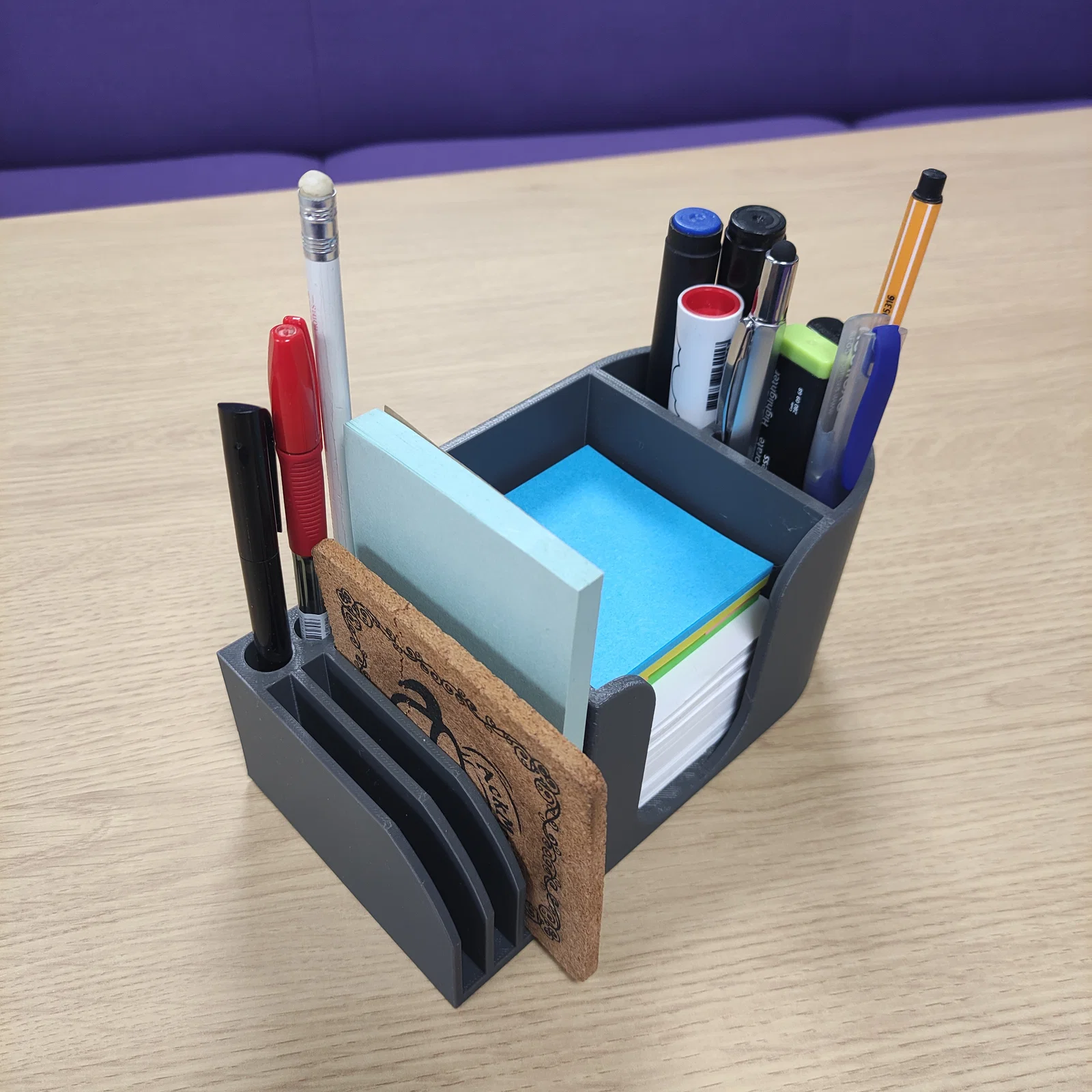 Bản remix khay sắp xếp bàn làm việc văn phòng: ngăn cắm bút/marker/sharpie, khay 90x90mm để giấy note và Post-it 3 inch, thêm 4 khe bên trái để Post-it lớn hoặc coaster. In không cần support.