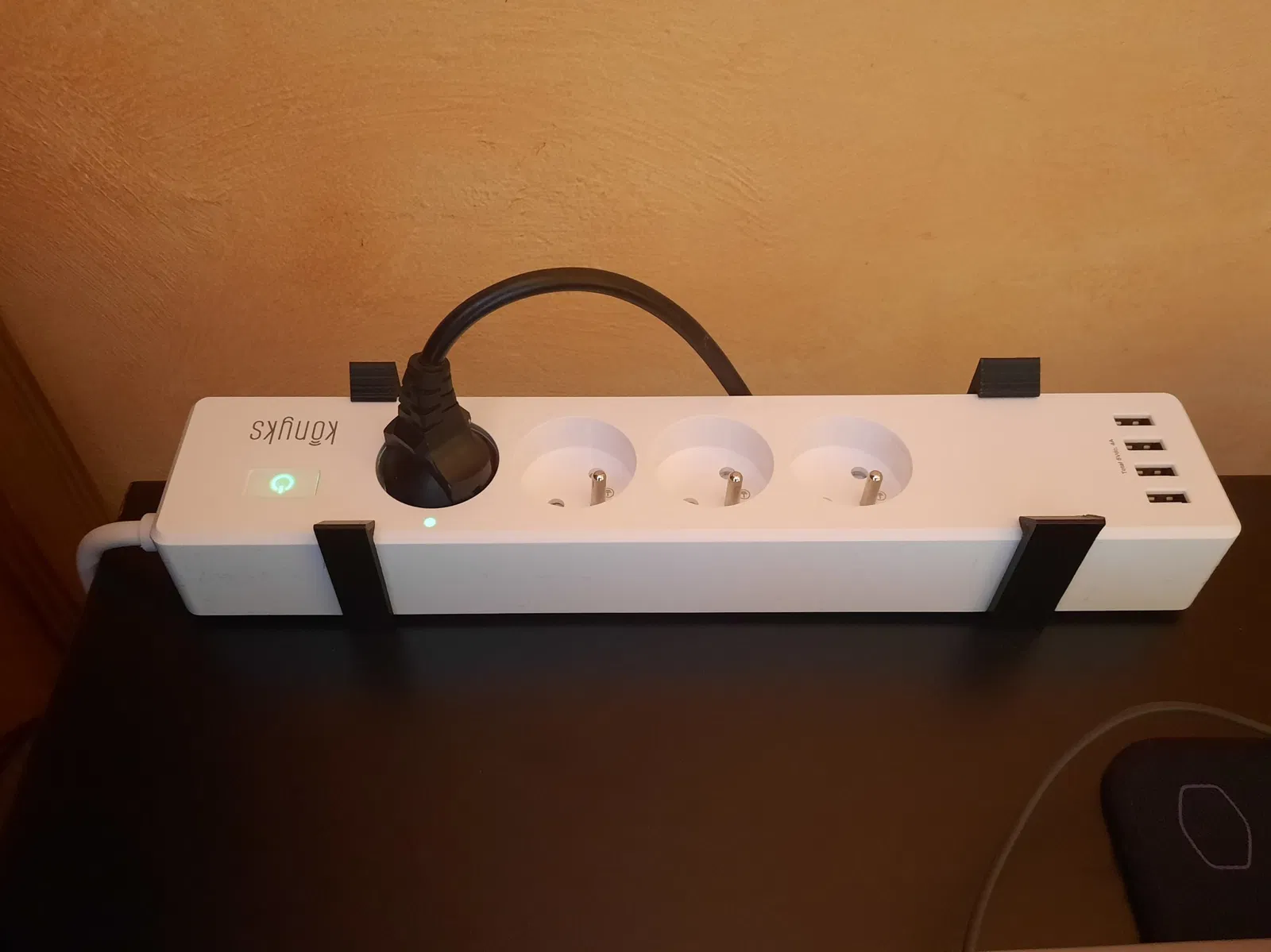 Tôi cần cố định ổ cắm nhiều lỗ trên mặt bàn của một chiếc bàn làm việc bổ sung. Cần phải đảm bảo rằng việc cố định có thể dễ dàng tháo rời.