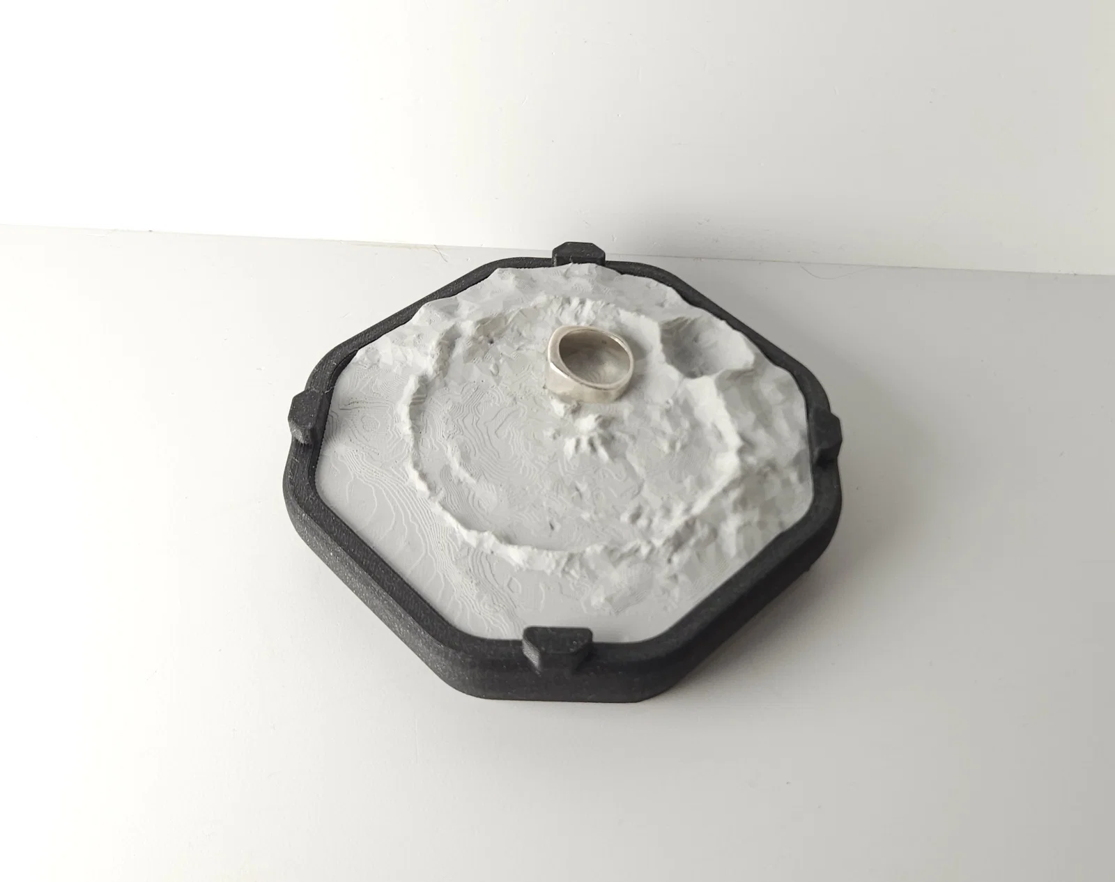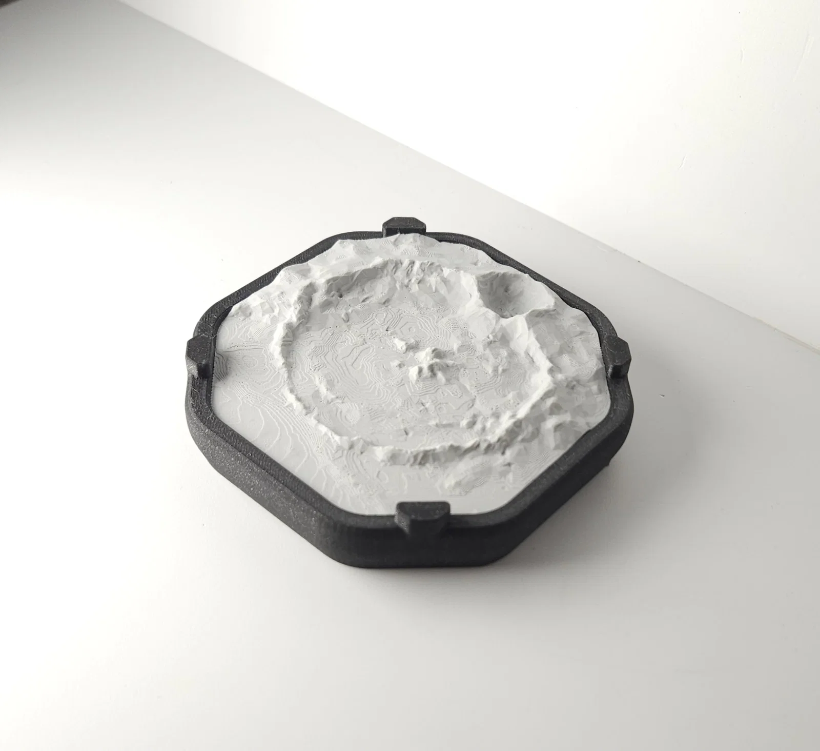 Khay “catch-all” mô phỏng bề mặt Mặt Trăng với miệng hố Copernicus (khoảng 93 km). Model dùng dữ liệu open-data từ NASA, render phóng đại theo phương đứng 3x. In không cần support, tác giả in 75% theo trục X/Y.