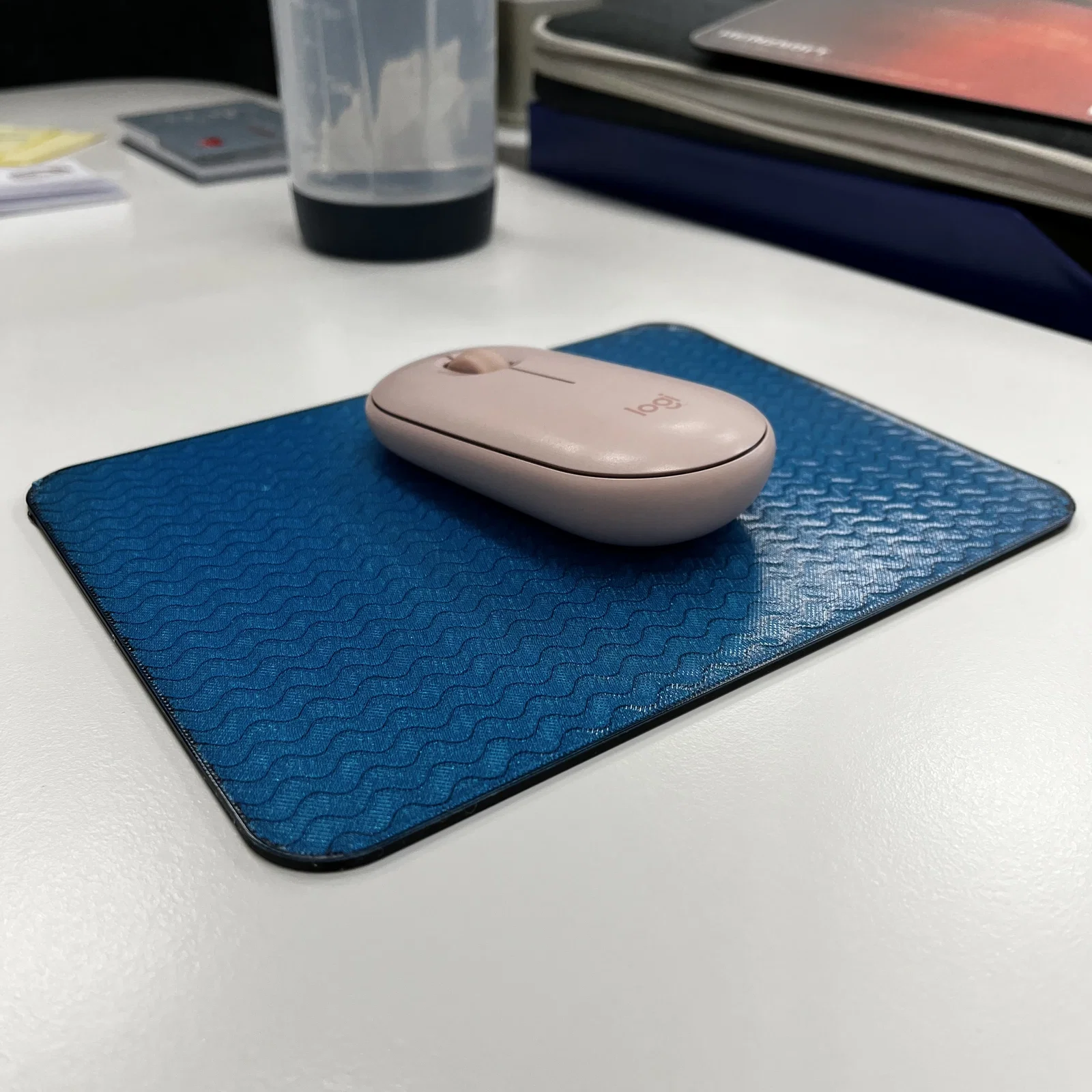 Mousepad 15x20x0,3cm in từ eSun TPU đen và xanh dương trong trên textured plate. Gợi ý đổi màu thủ công ở 2,20mm; nửa dưới TPU/Prusa Flex, nửa trên vật liệu cứng. Update: chỉ in 3–4 lớp màu xanh rồi dừng để tạo hiệu ứng infill.