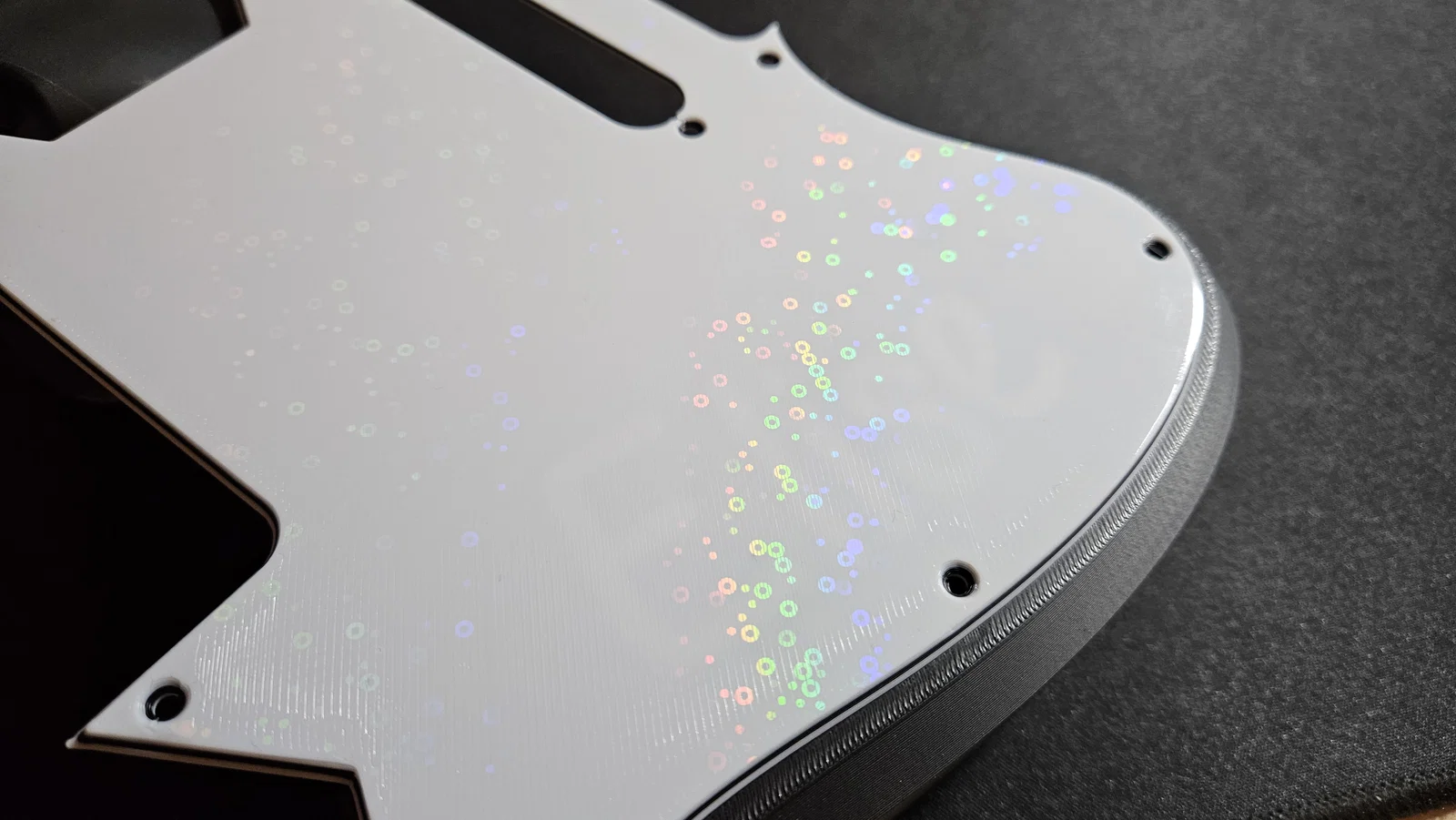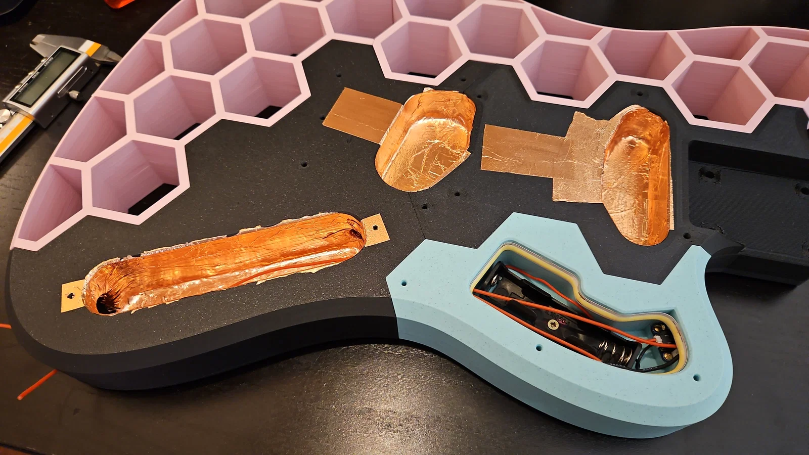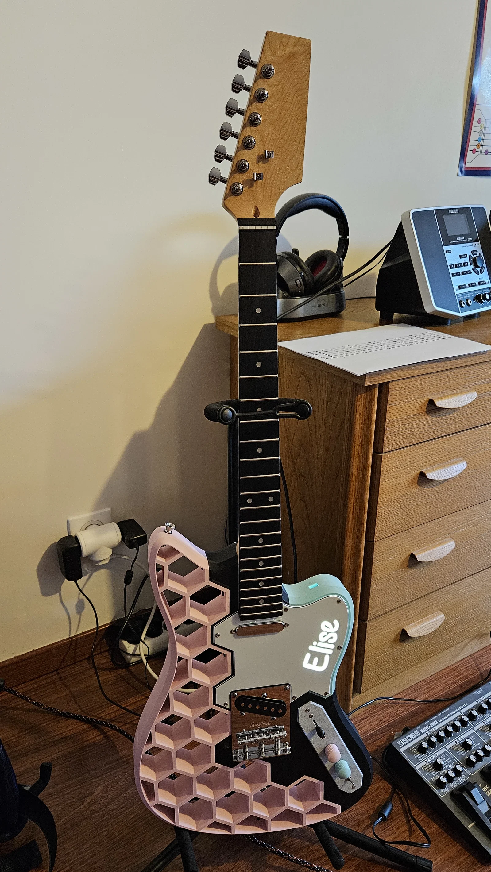 Một cây guitar điện có ngoại hình kiểu Prusacaster, nhưng đã được thiết kế lại hoàn toàn từ đầu để phù hợp với máy in Bambu Lab X1 và P1. Các máy nhỏ hơn (bed nhỏ hơn 256x256mm) sẽ không in được cây guitar này.