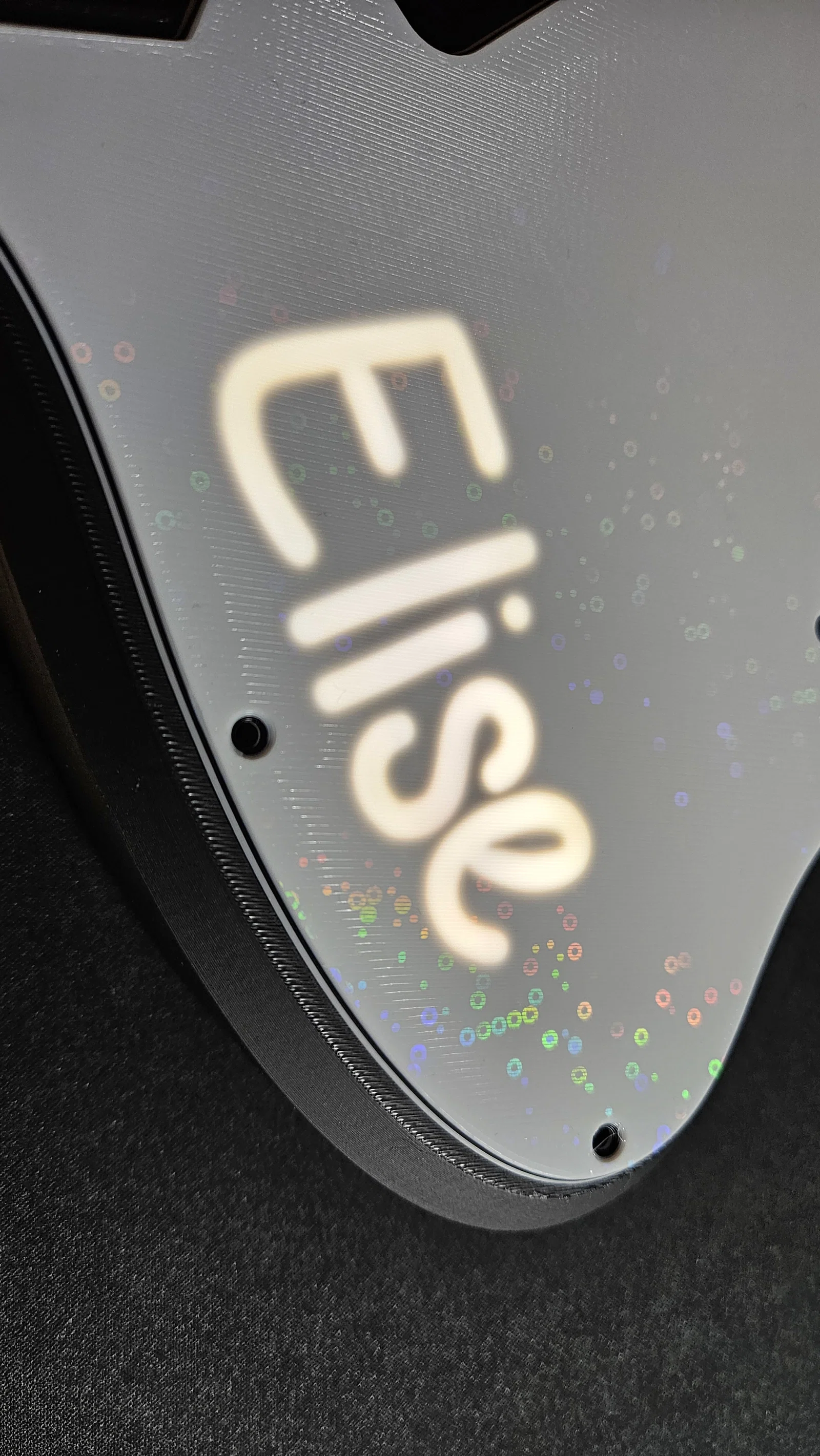 In pickguard với phần trung tâm màu đen (hoặc màu tối khác), và nhớ đảm bảo chữ/hình bạn muốn hiện ra khi bật LED phải “xuyên” qua được (thiết kế/chi tiết phải thông sáng) để khi LED ON nhìn thấy rõ.