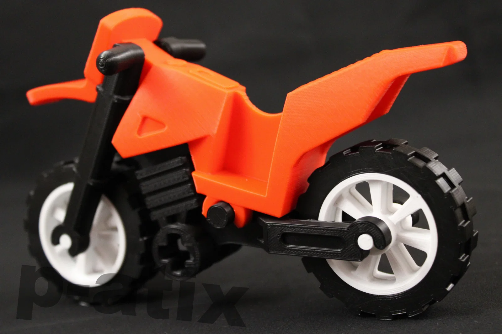 Mẫu Lego Dirt Bike dựa trên LEGO 50860c02 tỉ lệ 3:1. Part đã tối ưu cho in 3D, có một số file pre-supported và kèm cả part gốc không supports (cần supports khi in). Gợi ý: nozzle 0,4; layer 0.30–0.20mm; infill 10%.