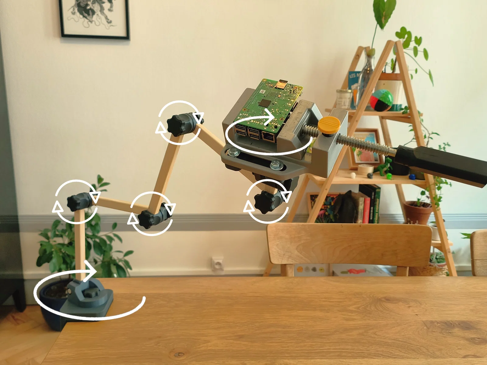 Cái tay gồm 4 hướng xoay khác nhau, mỗi khớp đều dùng cùng nguyên lý TPU/PLA. Bạn có: xoay ngang 360° cho phần đế, xoay dọc toàn phần cho từng đoạn tay, xoay 240° ở đầu tay, và kết hợp thêm xoay 360° cho plate gắn dụng cụ.
