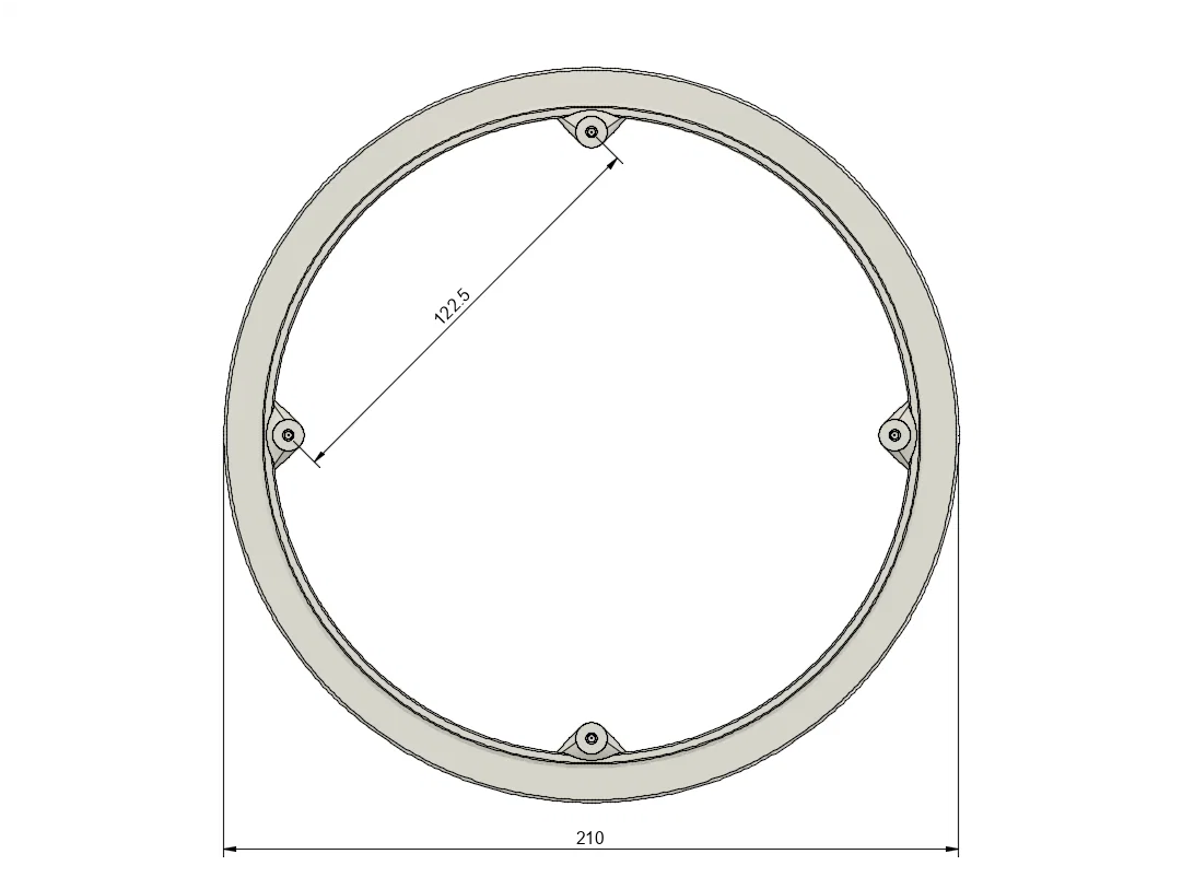 - Thông số kỹ thuật: Khoảng cách giữa các lỗ bắt vít là 122.5 mm, đường kính ngoài là 210 mm.