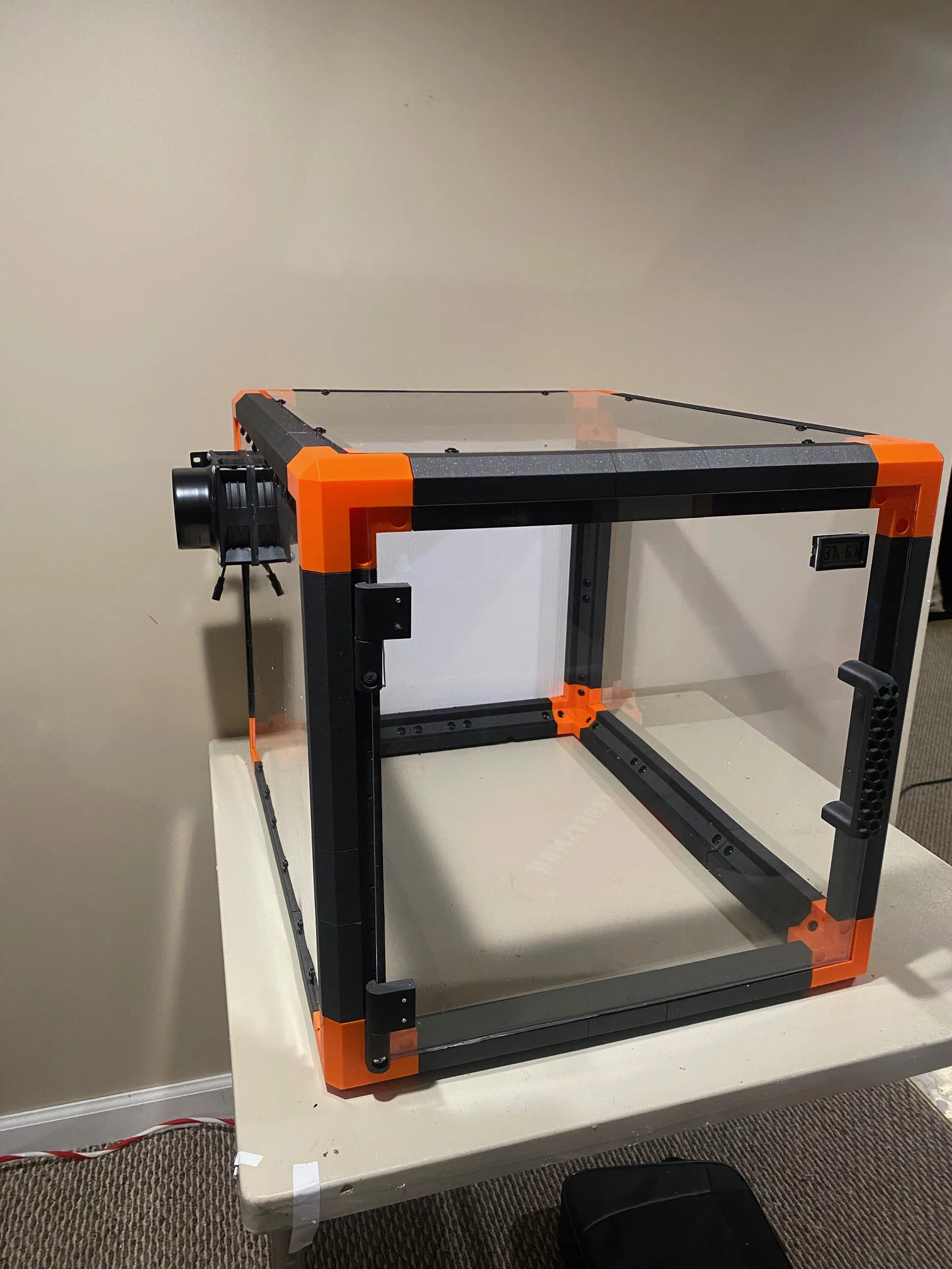 Bộ enclosure đầu tiên của mình có cửa trước 18"x18" và các mặt hông với mặt trên là 18"x24". Mình cần làm lớn hơn khi gắn thêm MMU3 để chừa chỗ cho buffer. (Hên là thiết kế modular!) Nên bản enclosure mới nhất của mình giờ có cửa 18"x24" và tất cả các mặt đều 18"x24". Phần top là 24"x24". Rất hài lòng với cái enclosure này.