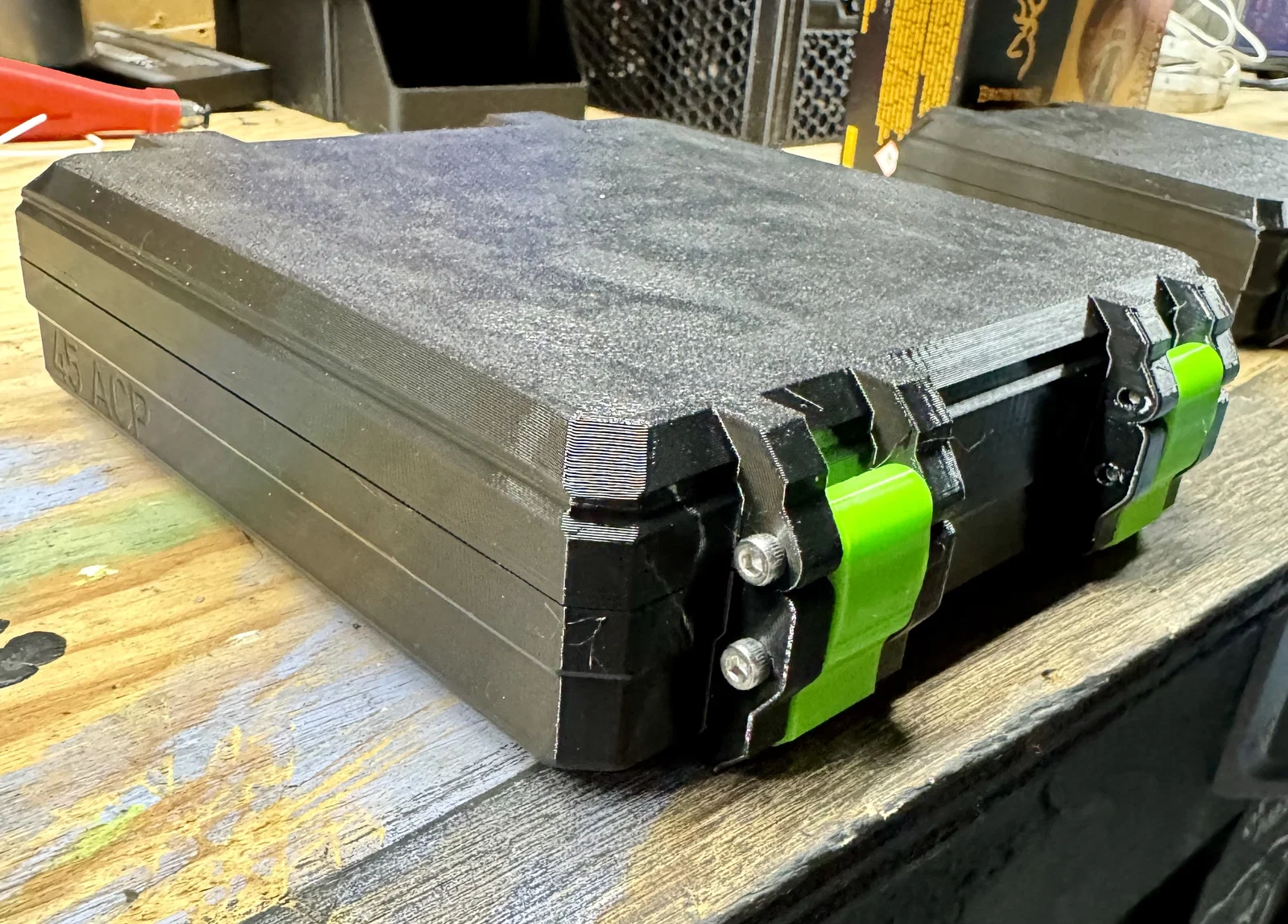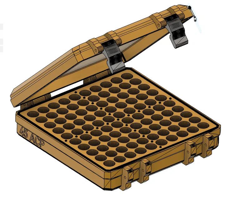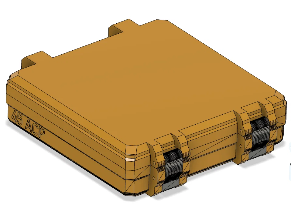 Hộp đạn (ammo case) chứa 100 viên .45 ACP, remix từ hộp 9mm 100 viên của MAK để vừa kích thước .45 ACP. Giữ vạch đánh dấu đáy để đếm theo 5 viên. In 5 walls, 25% infill; latches 100% infill.
