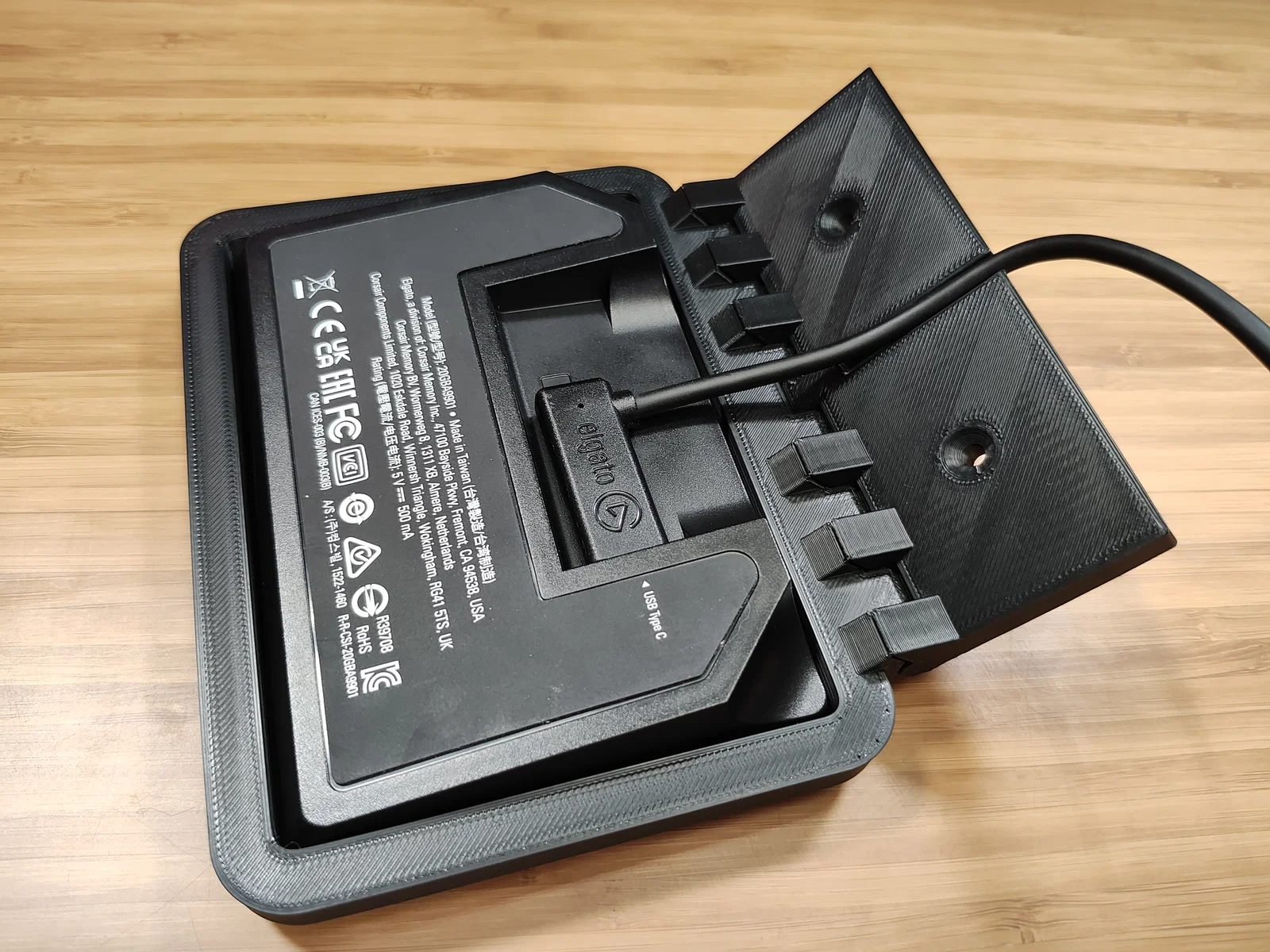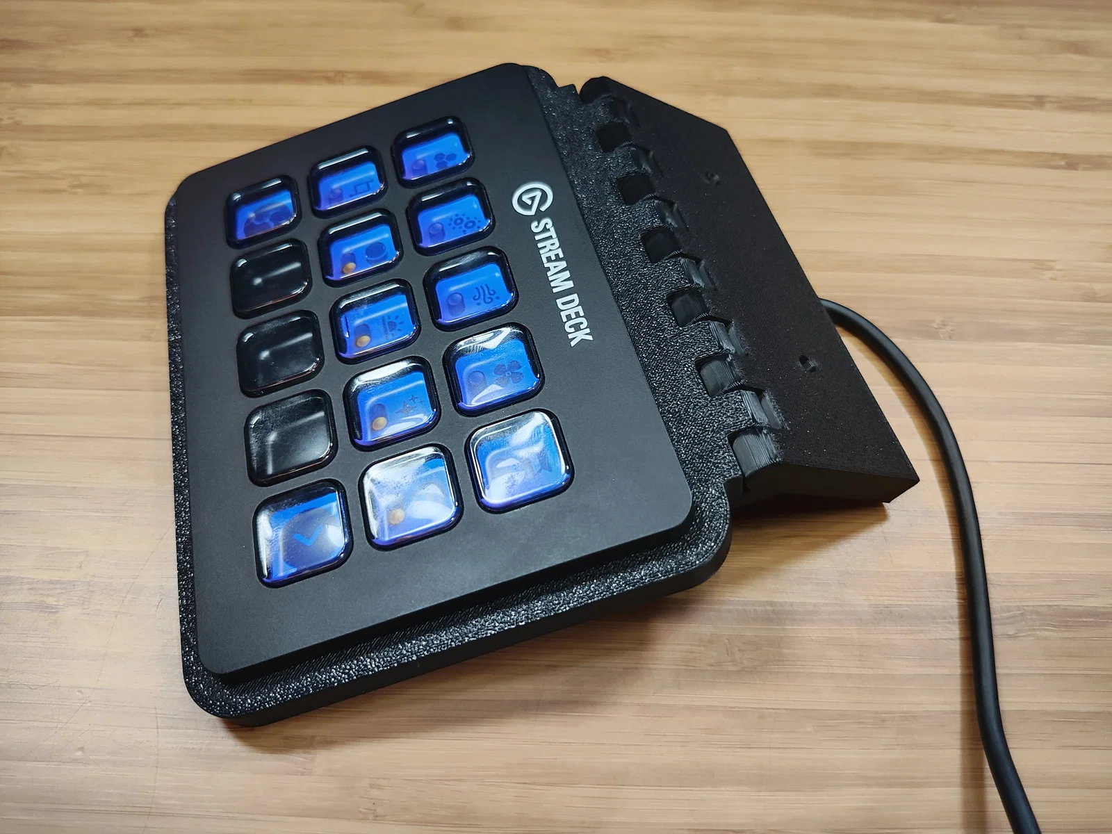Giá gắn snap-fit gọn gàng cho Elgato Stream Deck, bắt vít vào mặt dưới bàn. Có bản lề print-in-place để in phẳng rồi gập lên theo góc mong muốn; khuyến nghị nozzle 0.4mm và layer 0.2mm.