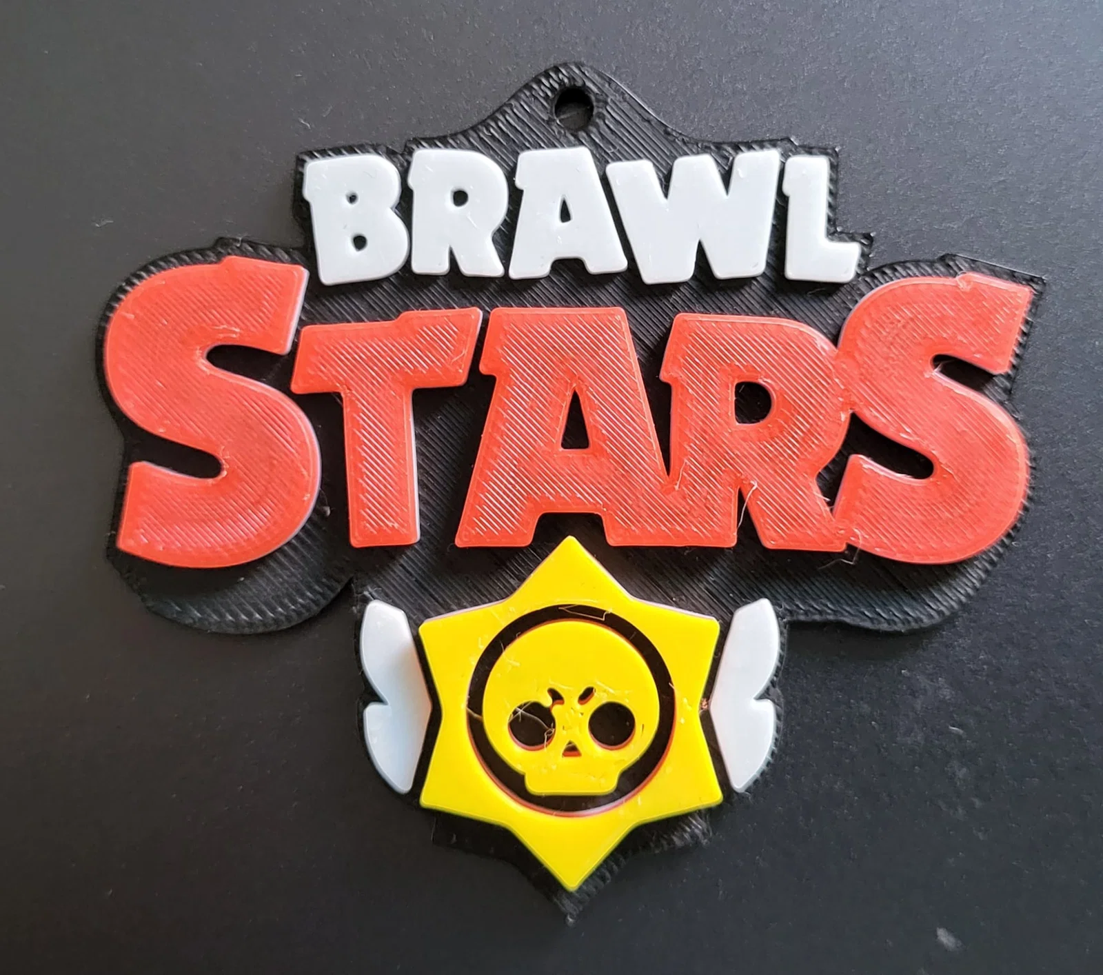 Móc treo móc khóa logo Brawl Stars in 4 màu bằng cách đổi màu filament theo layer. Bắt đầu đen, layer 11 trắng, layer 16 đỏ, layer 21 vàng. Layer height 0.2, không cần support.