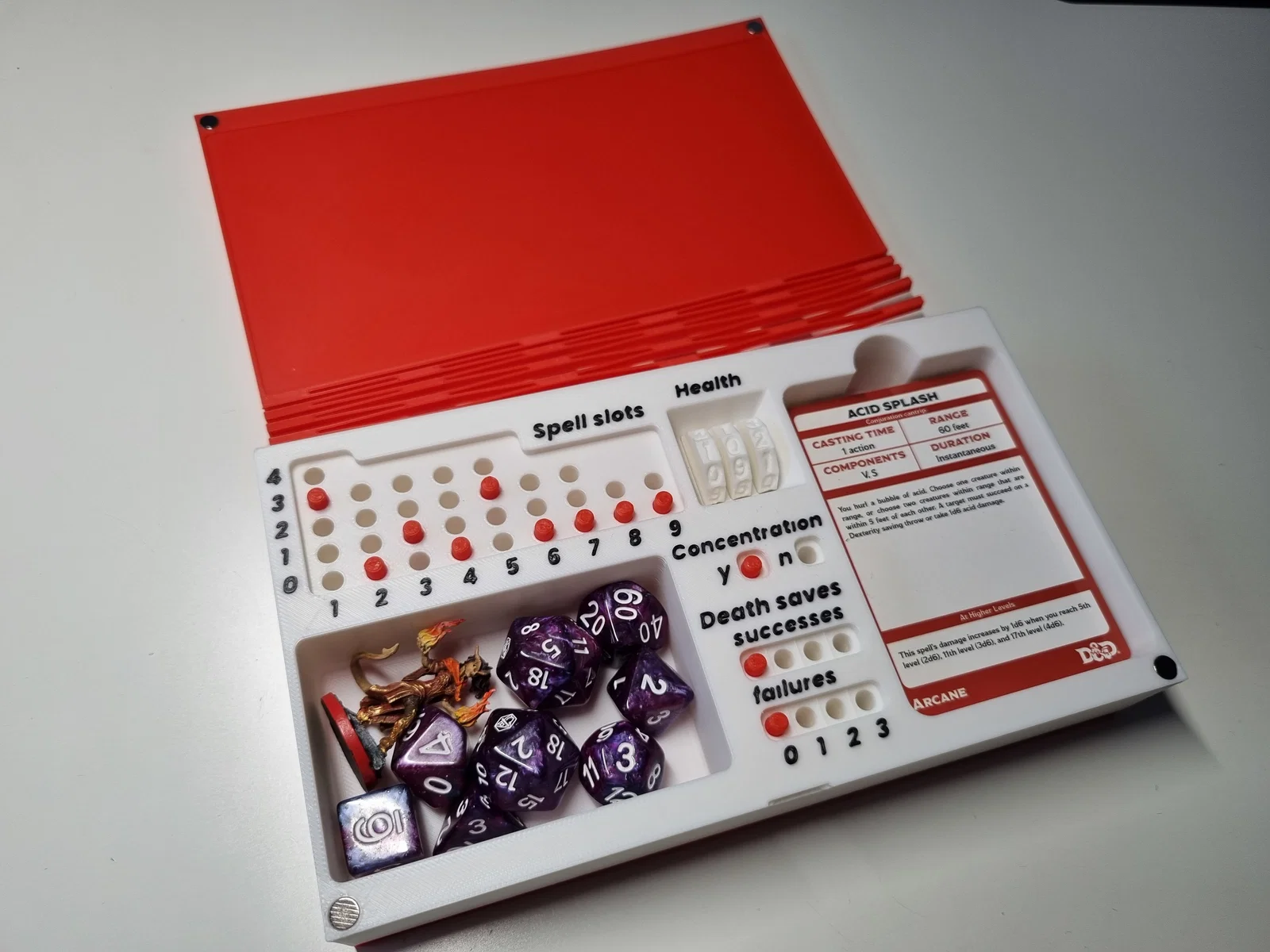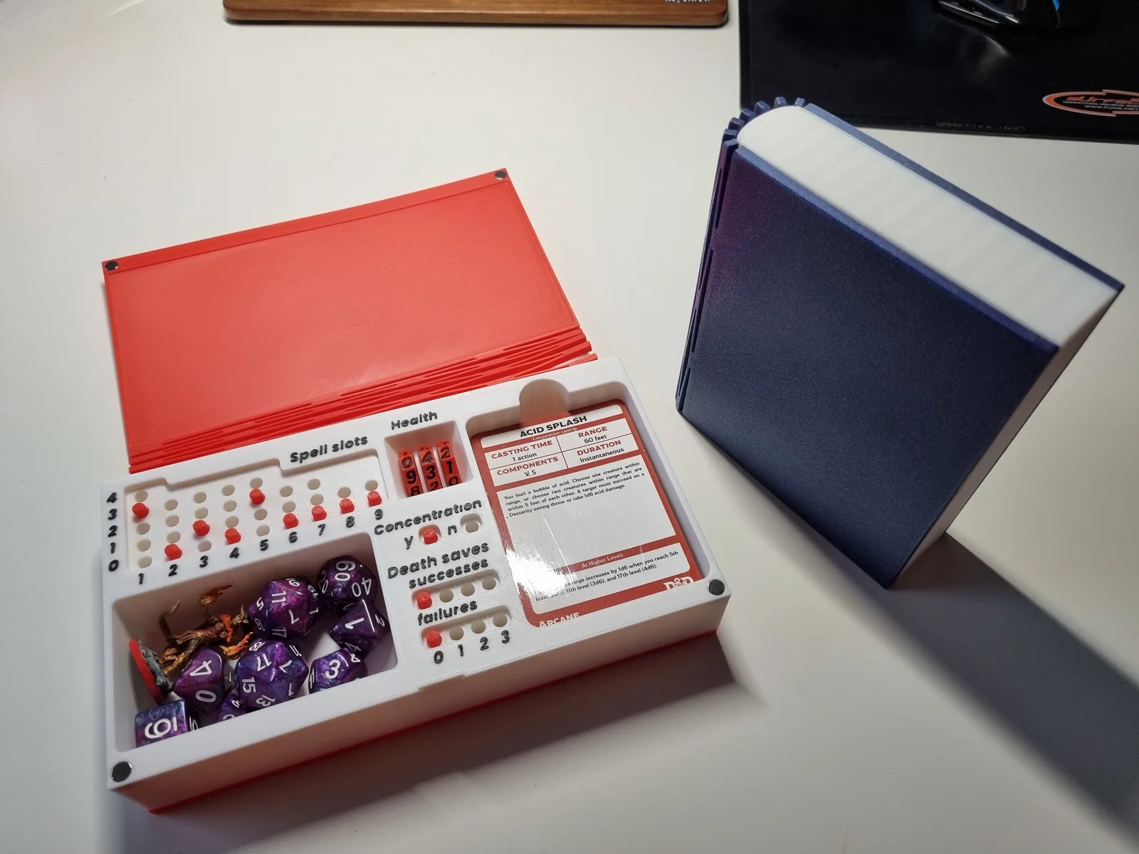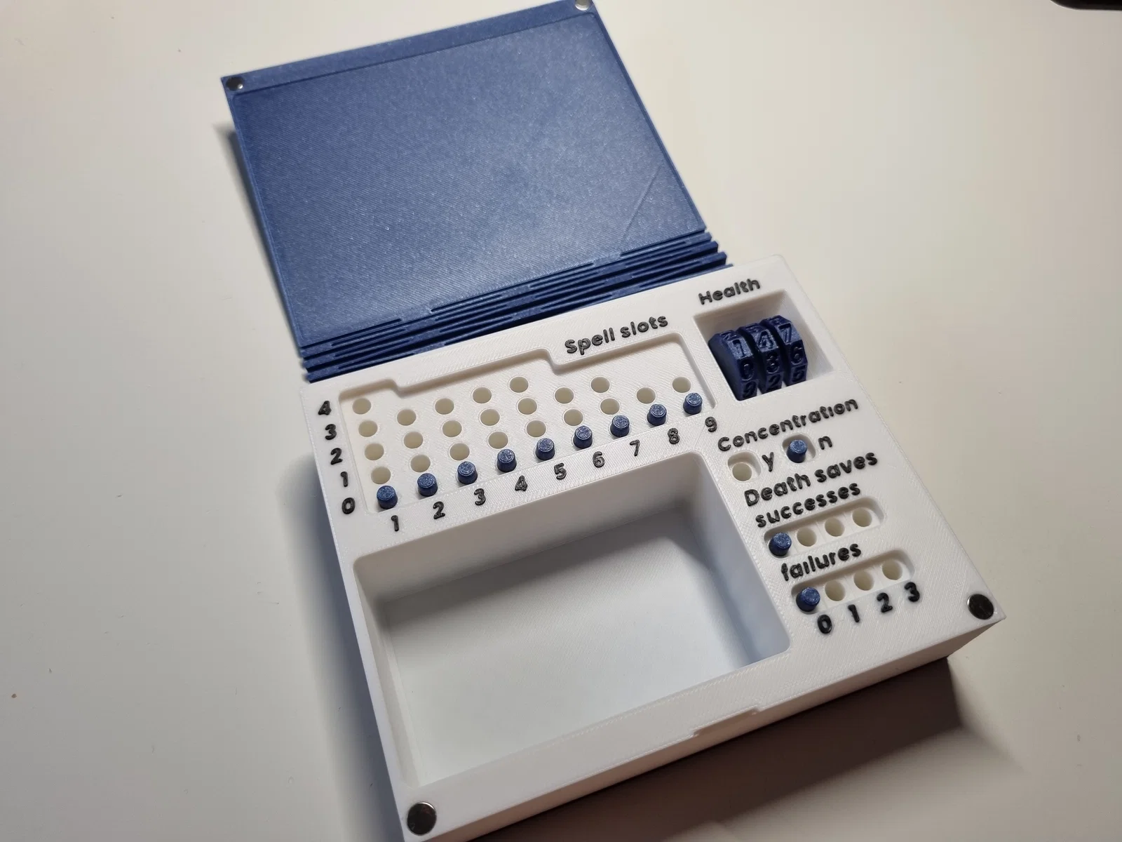 D&D Tracker Book giúp bạn theo dõi spell slots, cất spell cards và nhiều thứ khác. Bản in cần nam châm 6x3mm, yêu cầu bed adhesion rất tốt (print nâng cao), có mốc đổi màu ở 4.2mm và 34.2mm.