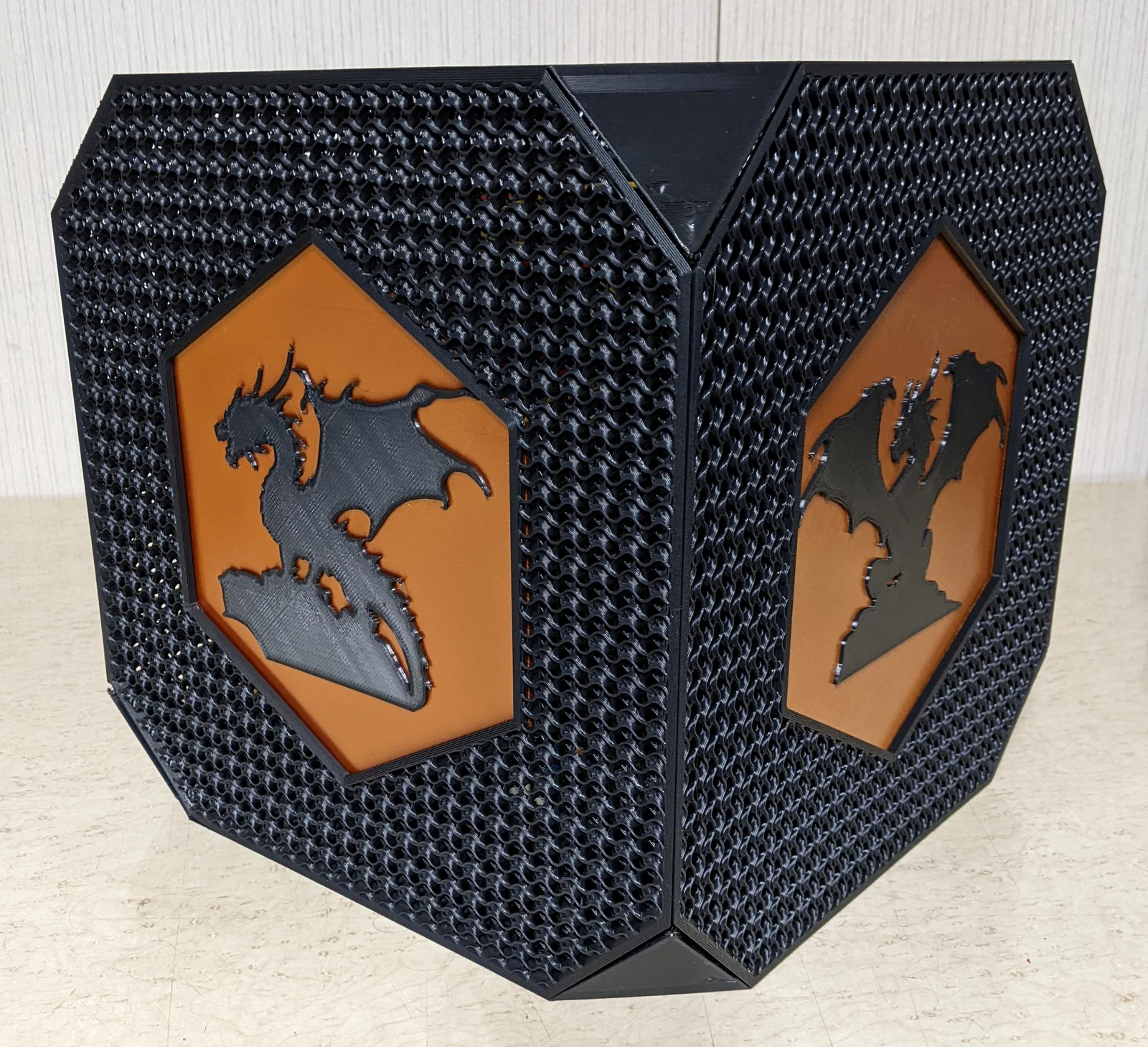 Đây là một case dạng khối lập phương 300mm, mình in trên Voron 350 chạy khoảng 100mm/s và mất tầm 26 tiếng để in. Mình in bằng Elegoo Rapid PLA+ màu đen và PLA silk màu đồng cho các phần insert. In ở layer height 0.32, infill 20% và không cần support.
