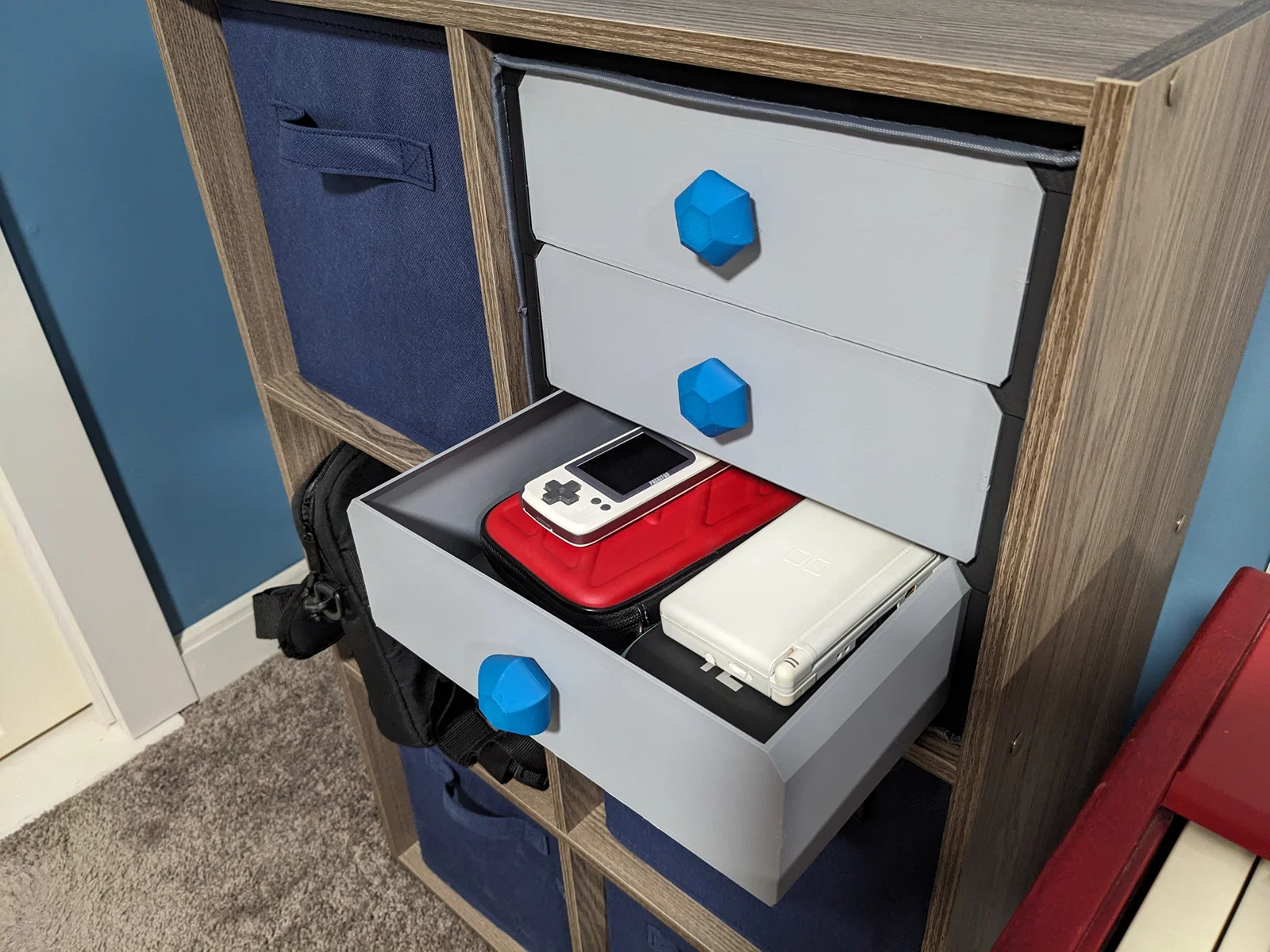 Biến storage cube vải 10.5x10.5x11" thành “tủ mini” có ngăn kéo với Storage Cube Drawer System. Bộ khung lắp đơn giản, in không cần supports; lưu ý drawers dễ curling, nên dùng brim và adhesion tốt.