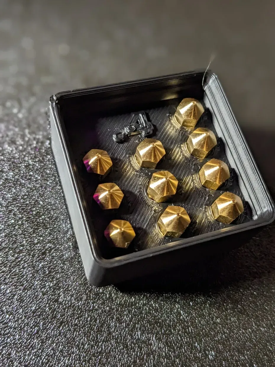 Một thùng Gridfinity 1x1 để lưu trữ đầy đủ 10 vòi phun dự phòng cho M5 và M5C! Tương thích với vòi phun núi lửa.