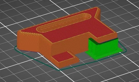 Cần supports – mình có thêm một vùng “support enforcer” ở đúng chỗ cần (xem hình trong slicer)