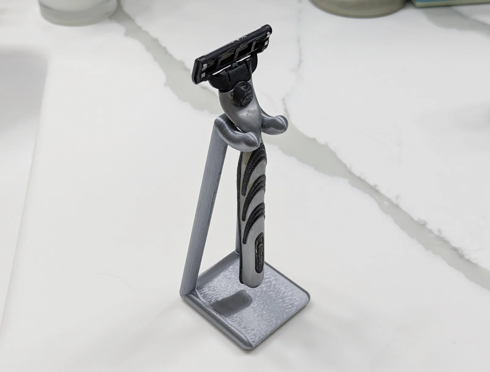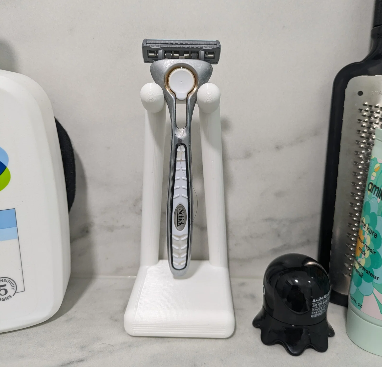 Giá đỡ dao cạo dạng parametric, dễ tùy biến cho nhiều kiểu cán khác nhau. Khuyến nghị in nằm ngửa, không cần supports. Có STL cho Mach3 và mẫu Schick Quattro; file SCAD cho phép chỉnh để hợp các loại khác.